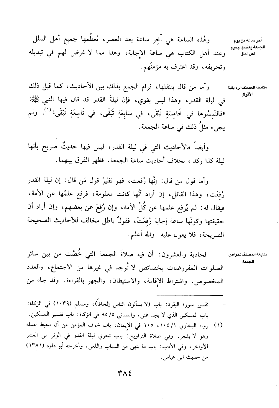 وَأَيْضًا فَالْأَحَادِيثُ الَّتِي فِي لَيْلَةِ الْقَدْرِ لَيْسَ فِيهَا حَدِيثٌ صَرِيحٌ بِأَنَّهَا لَيْلَةُ كَذَا وَكَذَا، بِخِلَافِ أَحَادِيثِ سَاعَةِ الْجُمُعَةِ فَظَهَرَ الْفَرْقُ بَيْنَهُمَا.