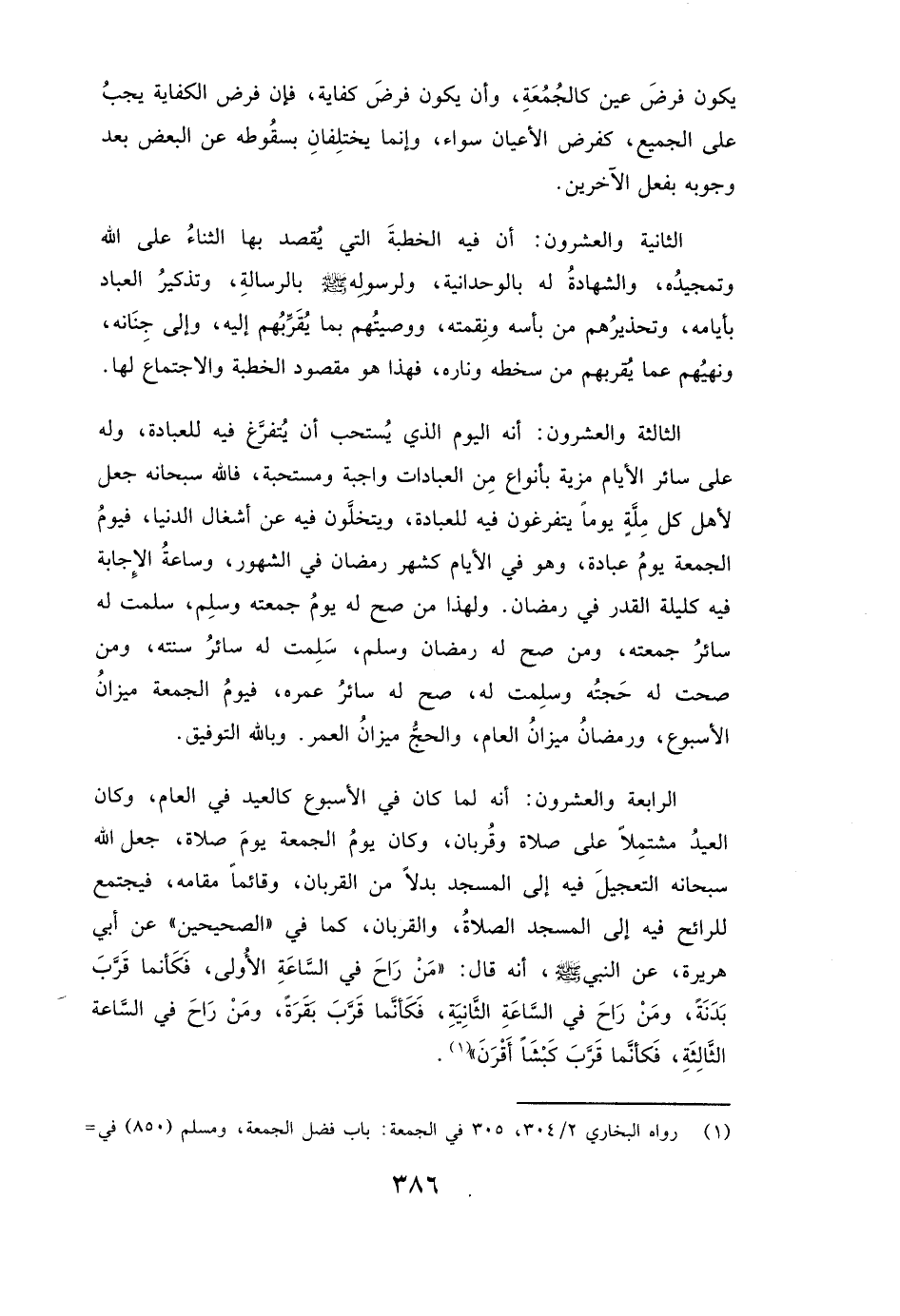 الرَّابِعَةُ وَالْعِشْرُونَ: أَنَّهُ لَمَّا كَانَ فِي الْأُسْبُوعِ كَالْعِيدِ فِي الْعَامِ، وَكَانَ الْعِيدُ مُشْتَمِلًا عَلَى صَلَاةٍ وَقُرْبَانٍ، وَكَانَ يَوْمُ الْجُمُعَةِ يَوْمَ صَلَاةٍ، جَعَلَ اللَّهُ سُبْحَانَهُ التَّعْجِيلَ فِيهِ إِلَى الْمَسْجِدِ بَدَلًا مِنَ الْقُرْبَانِ، وَقَائِمًا مَقَامَهُ فَيَجْتَمِعُ لِلرَّائِحِ فِيهِ إِلَى الْمَسْجِدِ الصَّلَاةُ، وَالْقُرْبَانُ كَمَا فِي " الصَّحِيحَيْنِ " عَنْ أَبِي هُرَيْرَةَ عَنِ النَّبِيِّ صَلَّى اللَّهَ عَلَيْهِ وَسَلَّمَ أَنَّهُ قَالَ: ( «مَنْ رَاحَ فِي السَّاعَةِ الْأُولَى فَكَأَنَّمَا قَرَّبَ بَدَنَةً، وَمَنْ رَاحَ فِي السَّاعَةِ الثَّانِيَةِ فَكَأَنَّمَا قَرَّبَ بَقَرَةً، وَمَنْ رَاحَ فِي السَّاعَةِ الثَّالِثَةِ فَكَأَنَّمَا قَرَّبَ كَبْشًا أَقْرَنَ» ) .