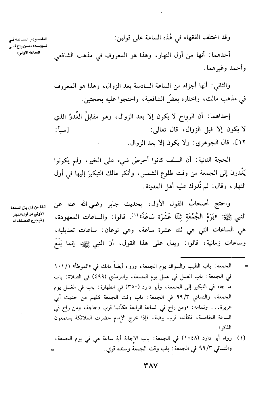 وَالثَّانِي: أَنَّهَا أَجْزَاءٌ مِنَ السَّاعَةِ السَّادِسَةِ بَعْدَ الزَّوَالِ، وَهَذَا هُوَ الْمَعْرُوفُ فِي مَذْهَبِ مالك، وَاخْتَارَهُ بَعْضُ الشَّافِعِيَّةِ وَاحْتَجُّوا عَلَيْهِ بِحُجَّتَيْنِ. إِحْدَاهُمَا: أَنَّ الرَّوَاحَ لَا يَكُونُ إِلَّا بَعْدَ الزَّوَالِ، وَهُوَ مُقَابِلُ الْغُدُوِّ الَّذِي لَا يَكُونُ إِلَّا قَبْلَ الزَّوَالِ قَالَ تَعَالَى: {وَرَوَاحُهَا شَهْرٌ} [سبأ: 12] [سَبَأٍ: 12] . قَالَ الجوهري: وَلَا يَكُونُ إِلَّا بَعْدَ الزَّوَالِ.