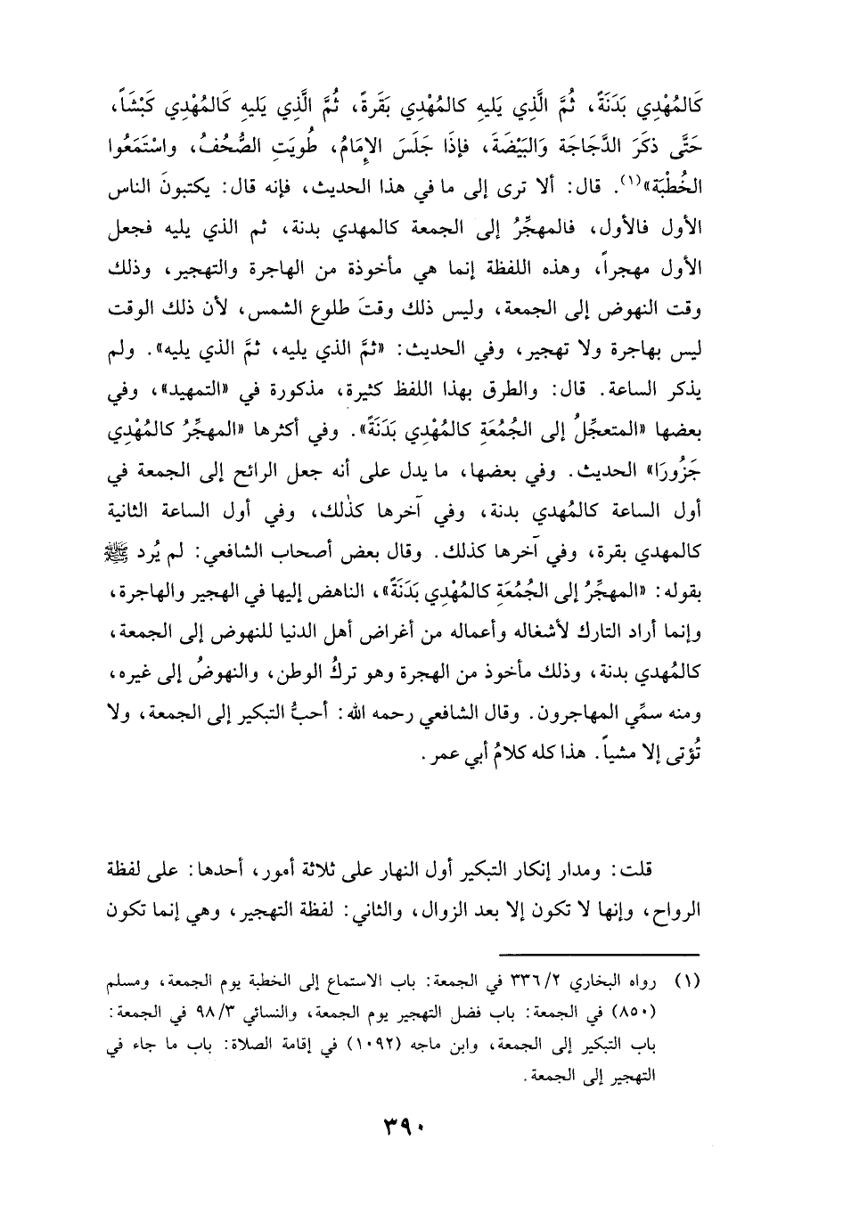 كَالْمُهْدِي بَدَنَةً، ثُمَّ الَّذِي يَلِيهِ كَالْمُهْدِي بَقَرَةً، ثُمَّ الَّذِي يَلِيهِ كَالْمُهْدِي كَبْشًا، حَتَّى ذَكَرَ الدَّجَاجَةَ وَالْبَيْضَةَ، فَإِذَا جَلَسَ الْإِمَامُ طُوِيَتِ الصَّحُفُ وَاسْتَمَعُوا الْخُطْبَةَ» ) قَالَ: أَلَا تَرَى إِلَى مَا فِي هَذَا الْحَدِيثِ فَإِنَّهُ قَالَ: «يَكْتُبُونَ النَّاسَ الْأَوَّلَ فَالْأَوَّلَ، فَالْمُهَجِّرُ إِلَى الْجُمُعَةِ كَالْمُهْدِي بَدَنَةً ثُمَّ الَّذِي يَلِيهِ» ، فَجَعَلَ الْأَوَّلَ مُهَجِّرًا، وَهَذِهِ اللَّفْظَةُ إِنَّمَا هِيَ مَأْخُوذَةٌ مِنَ الْهَاجِرَةِ وَالتَّهْجِيرِ، وَذَلِكَ وَقْتُ النُّهُوضِ إِلَى الْجُمُعَةِ وَلَيْسَ ذَلِكَ وَقْتَ طُلُوعِ الشَّمْسِ، لِأَنَّ ذَلِكَ الْوَقْتَ لَيْسَ بِهَاجِرَةٍ وَلَا تَهْجِيرٍ، وَفِي الْحَدِيثِ: " «ثُمَّ الَّذِي يَلِيهِ ثُمَّ الَّذِي يَلِيهِ» ". وَلَمْ يَذْكُرِ السَّاعَةَ. قَالَ وَالطُّرُقُ بِهَذَا اللَّفْظِ كَثِيرَةٌ مَذْكُورَةٌ فِي " التَّمْهِيدِ " وَفِي بَعْضِهَا ( «الْمُتَعَجِّلُ إِلَى الْجُمُعَةِ كَالْمُهْدِي بَدَنَةً» ) ".