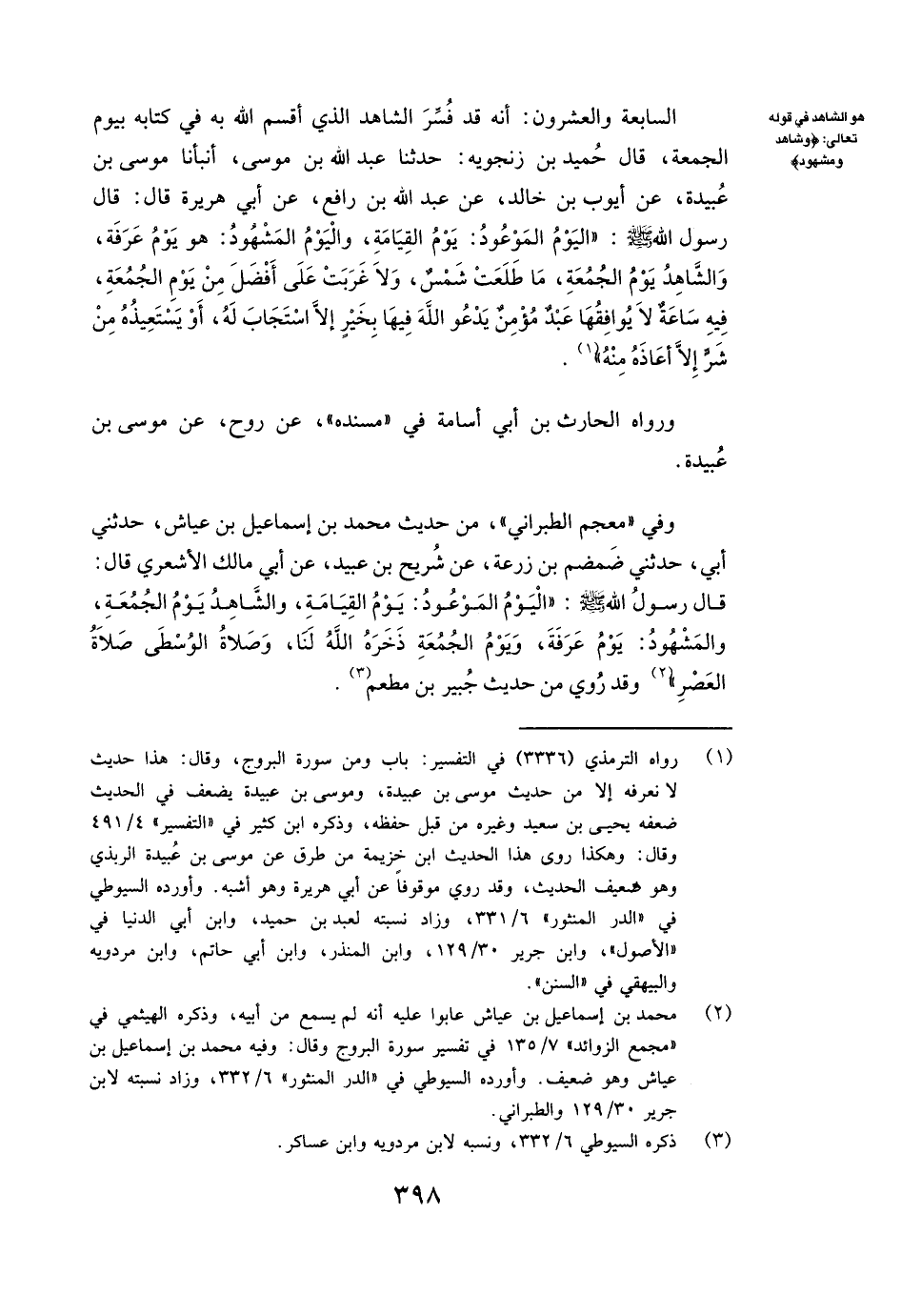 السَّابِعَةُ وَالْعِشْرُونَ: أَنَّهُ قَدْ فُسِّرَ الشَّاهِدُ الَّذِي أَقْسَمَ اللَّهُ بِهِ فِي كِتَابِهِ بِيَوْمِ الْجُمُعَةِ، قَالَ حُمَيْدُ بْنُ زَنْجَوَيْهِ: حَدَّثَنَا عبد الله بن موسى أَنْبَأَنَا مُوسَى بْنُ عُبَيْدَةَ عَنْ أيوب بن خالد عَنْ عبد الله بن رافع عَنْ أَبِي هُرَيْرَةَ قَالَ: قَالَ رَسُولُ اللَّهِ صَلَّى اللَّهُ عَلَيْهِ وَسَلَّمَ: ( «الْيَوْمُ الْمَوْعُودُ يَوْمُ الْقِيَامَةِ، وَالْيَوْمُ الْمَشْهُودُ هُوَ يَوْمُ عَرَفَةَ، وَالشَّاهِدُ يَوْمُ الْجُمُعَةِ، مَا طَلَعَتْ شَمْسٌ وَلَا غَرَبَتْ عَلَى أَفْضَلَ مِنْ يَوْمِ الْجُمُعَةِ، فِيهِ سَاعَةٌ لَا يُوَافِقُهَا عَبْدٌ مُؤْمِنٌ يَدْعُو اللَّهَ فِيهَا بِخَيْرٍ إِلَّا اسْتَجَابَ لَهُ، أَوْ يَسْتَعِيذُهُ مِنْ شَرٍّ إِلَّا أَعَاذَهُ مِنْهُ» ) .