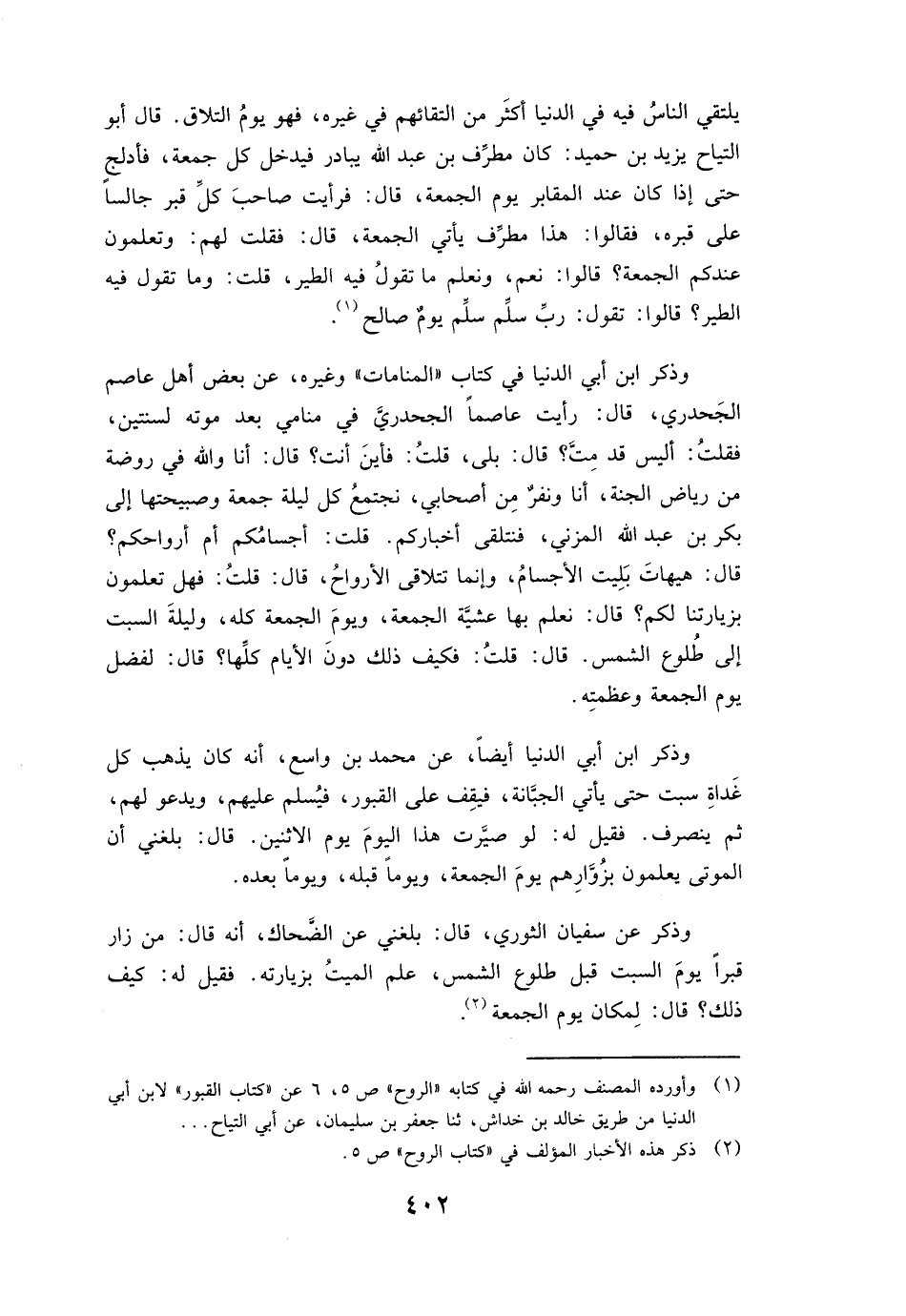 وَذَكَرَ ابْنُ أَبِي الدُّنْيَا فِي كِتَابِ " الْمَنَامَاتِ " وَغَيْرِهِ، عَنْ بَعْضِ أَهْلِ عاصم الجحدري، قَالَ: رَأَيْتُ عاصما الجحدري فِي مَنَامِي بَعْدَ مَوْتِهِ لِسَنَتَيْنِ، فَقُلْتُ: أَلَيْسَ قَدْ مِتَّ؟ قَالَ: بَلَى، قُلْتُ: فَأَيْنَ أَنْتَ؟ قَالَ: أَنَا وَاللَّهِ فِي رَوْضَةٍ مِنْ رِيَاضِ الْجَنَّةِ، أَنَا وَنَفَرٌ مِنْ أَصْحَابِي، نَجْتَمِعُ كُلَّ لَيْلَةِ جُمُعَةٍ وَصَبِيحَتِهَا إِلَى بَكْرِ بْنِ عَبْدِ اللَّهِ الْمُزَنِيِّ فَنَتَلَقَّى أَخْبَارَكُمْ. قُلْتُ: أَجْسَامُكُمْ أَمْ أَرْوَاحُكُمْ؟ قَالَ: هَيْهَاتَ بَلِيَتِ الْأَجْسَامُ وَإِنَّمَا تَتَلَاقَى الْأَرْوَاحُ، قَالَ: قُلْتُ: فَهَلْ تَعْلَمُونَ بِزِيَارَتِنَا لَكُمْ؟ قَالَ: نَعْلَمُ بِهَا عَشِيَّةَ الْجُمُعَةِ، وَيَوْمَ الْجُمُعَةِ كُلَّهُ، وَلَيْلَةَ السَّبْتِ إِلَى طُلُوعِ الشَّمْسِ. قَالَ: قُلْتُ: فَكَيْفَ ذَلِكَ دُونَ الْأَيَّامِ كُلِّهَا؟ قَالَ: لِفَضْلِ يَوْمِ الْجُمُعَةِ وَعَظَمَتِهِ.