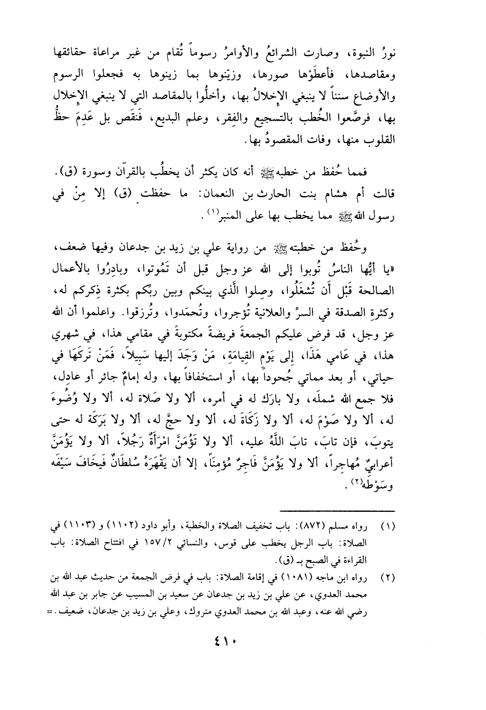 وَحُفِظَ مِنْ خُطْبَتِهِ صَلَّى اللَّهُ عَلَيْهِ وَسَلَّمَ مِنْ رِوَايَةِ عَلِيِّ بْنِ زَيْدِ بْنِ جُدْعَانَ وَفِيهَا ضَعْفٌ " ( «يَا أَيُّهَا النَّاسُ تُوبُوا إِلَى اللَّهِ عَزَّ وَجَلَّ قَبْلَ أَنْ تَمُوتُوا، وَبَادِرُوا بِالْأَعْمَالِ الصَّالِحَةِ قَبْلَ أَنْ تَشْغَلُوا، وَصِلُوا الَّذِي بَيْنَكُمْ وَبَيْنَ رَبِّكُمْ بِكَثْرَةِ ذِكْرِكُمْ لَهُ وَكَثْرَةِ الصَّدَقَةِ فِي السِّرِّ وَالْعَلَانِيَةِ تُؤْجَرُوا وَتُحْمَدُوا وَتُرْزَقُوا. وَاعْلَمُوا أَنَّ اللَّهَ عَزَّ وَجَلَّ قَدْ فَرَضَ عَلَيْكُمُ الْجُمُعَةَ فَرِيضَةً مَكْتُوبَةً فِي مَقَامِي هَذَا، فِي شَهْرِي هَذَا فِي عَامِي هَذَا إِلَى يَوْمِ الْقِيَامَةِ، مَنْ وَجَدَ إِلَيْهَا سَبِيلًا، فَمَنْ تَرَكَهَا فِي حَيَاتِي أَوْ بَعْدَ مَمَاتِي جُحُودًا بِهَا أَوِ اسْتِخْفَافًا بِهَا وَلَهُ إِمَامٌ جَائِرٌ أَوْ عَادِلٌ، فَلَا جَمَعَ اللَّهُ شَمْلَهُ وَلَا بَارَكَ لَهُ فِي أَمْرِهِ، أَلَا وَلَا صَلَاةَ لَهُ، أَلَا وَلَا وُضُوءَ لَهُ، أَلَا وَلَا صَوْمَ لَهُ، أَلَا وَلَا زَكَاةَ لَهُ، أَلَا وَلَا حَجَّ لَهُ، أَلَا وَلَا بَرَكَةَ لَهُ حَتَّى يَتُوبَ، فَإِنْ تَابَ تَابَ اللَّهُ عَلَيْهِ، أَلَا وَلَا تَؤُمَّنَّ امْرَأَةٌ رَجُلًا، أَلَا وَلَا يَؤُمَّنَّ أَعْرَابِيٌّ مُهَاجِرًا، أَلَا وَلَا يَؤُمَّنَّ فَاجِرٌ مُؤْمِنًا، إِلَّا أَنْ يَقْهَرَهُ سُلْطَانٌ فَيَخَافَ سَيْفَهُ وَسَوْطَهُ» ) .