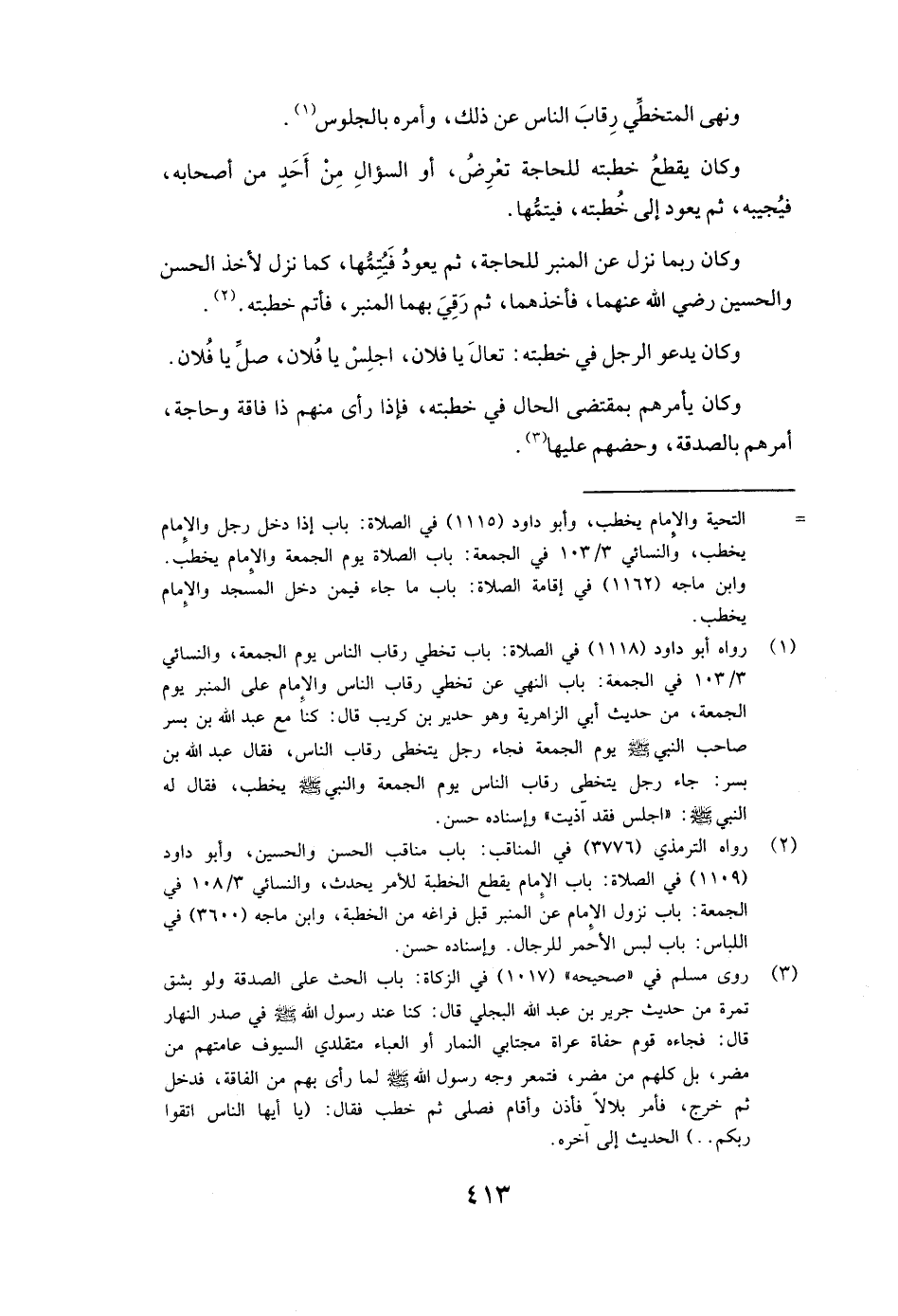 وَكَانَ يَقْطَعُ خُطْبَتَهُ لِلْحَاجَةِ تَعْرِضُ، أَوِ السُّؤَالِ مِنْ أَحَدٍ مِنْ أَصْحَابِهِ، فَيُجِيبُهُ، ثُمَّ يَعُودُ إِلَى خُطْبَتِهِ، فَيُتِمُّهَا.