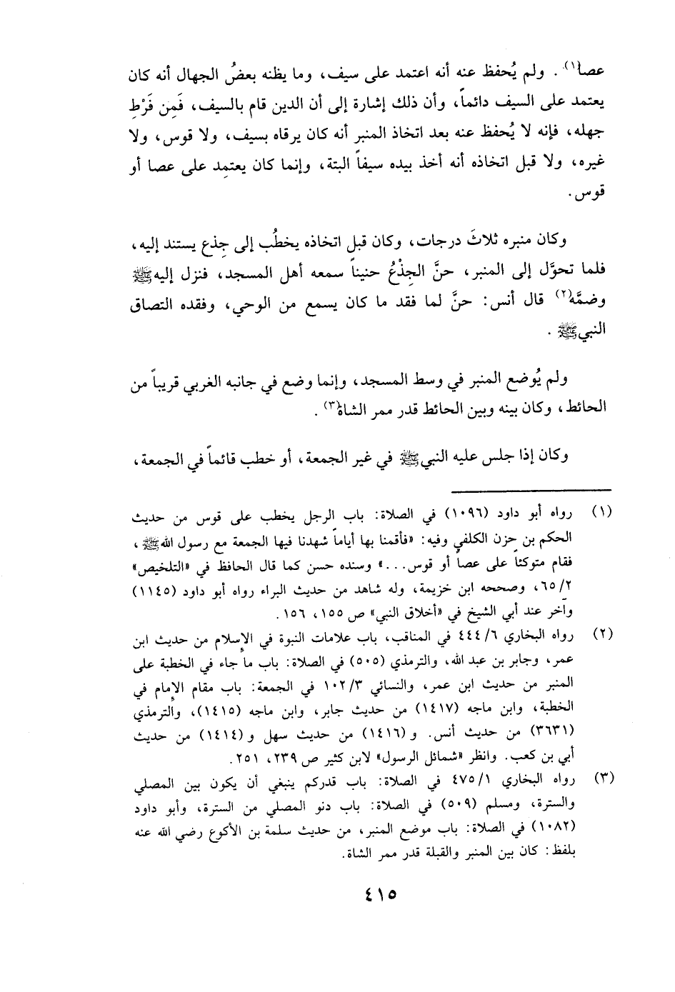 عَصًا. وَلَمْ يُحْفَظْ عَنْهُ أَنَّهُ اعْتَمَدَ عَلَى سَيْفٍ، وَمَا يَظُنُّهُ بَعْضُ الْجُهَّالِ أَنَّهُ كَانَ يَعْتَمِدُ عَلَى السَّيْفِ دَائِمًا، وَأَنَّ ذَلِكَ إِشَارَةٌ إِلَى أَنَّ الدِّينَ قَامَ بِالسَّيْفِ، فَمِنْ فَرْطِ جَهْلِهِ، فَإِنَّهُ لَا يُحْفَظُ عَنْهُ بَعْدُ اتِّخَاذُ الْمِنْبَرِ أَنَّهُ كَانَ يَرْقَاهُ بِسَيْفٍ وَلَا قَوْسٍ وَلَا غَيْرِهِ، وَلَا قَبْلَ اتِّخَاذِهِ أَنَّهُ أَخَذَ بِيَدِهِ سَيْفًا الْبَتَّةَ وَإِنَّمَا كَانَ يَعْتَمِدُ عَلَى عَصًا أَوْ قَوْسٍ.
