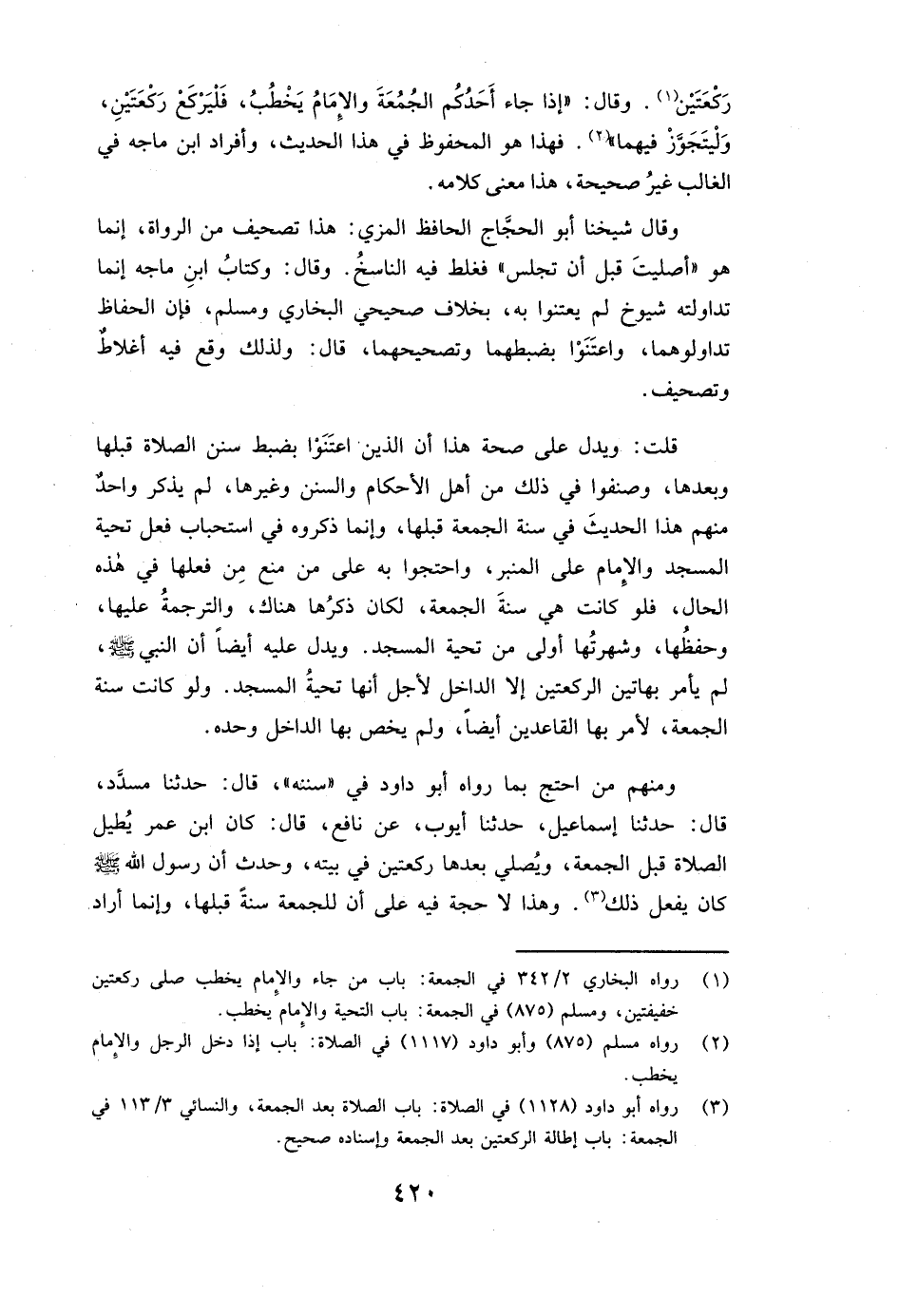 قُلْتُ: وَيَدُلُّ عَلَى صِحَّةِ هَذَا أَنَّ الَّذِينَ اعْتَنَوْا بِضَبْطِ سُنَنِ الصَّلَاةِ قَبْلَهَا وَبَعْدَهَا، وَصَنَّفُوا فِي ذَلِكَ مِنْ أَهْلِ الْأَحْكَامِ وَالسُّنَنِ وَغَيْرِهَا، لَمْ يَذْكُرْ وَاحِدٌ مِنْهُمْ هَذَا الْحَدِيثَ فِي سُنَّةِ الْجُمُعَةِ قَبْلَهَا، وَإِنَّمَا ذَكَرُوهُ فِي اسْتِحْبَابِ فِعْلِ تَحِيَّةِ الْمَسْجِدِ وَالْإِمَامُ عَلَى الْمِنْبَرِ، وَاحْتَجُّوا بِهِ عَلَى مَنْ مَنَعَ مِنْ فِعْلِهَا فِي هَذِهِ الْحَالِ فَلَوْ كَانَتْ هِيَ سُنَّةَ الْجُمُعَةِ لَكَانَ ذِكْرُهَا هُنَاكَ، وَالتَّرْجَمَةُ عَلَيْهَا وَحِفْظُهَا وَشُهْرَتُهَا أَوْلَى مِنْ تَحِيَّةِ الْمَسْجِدِ.