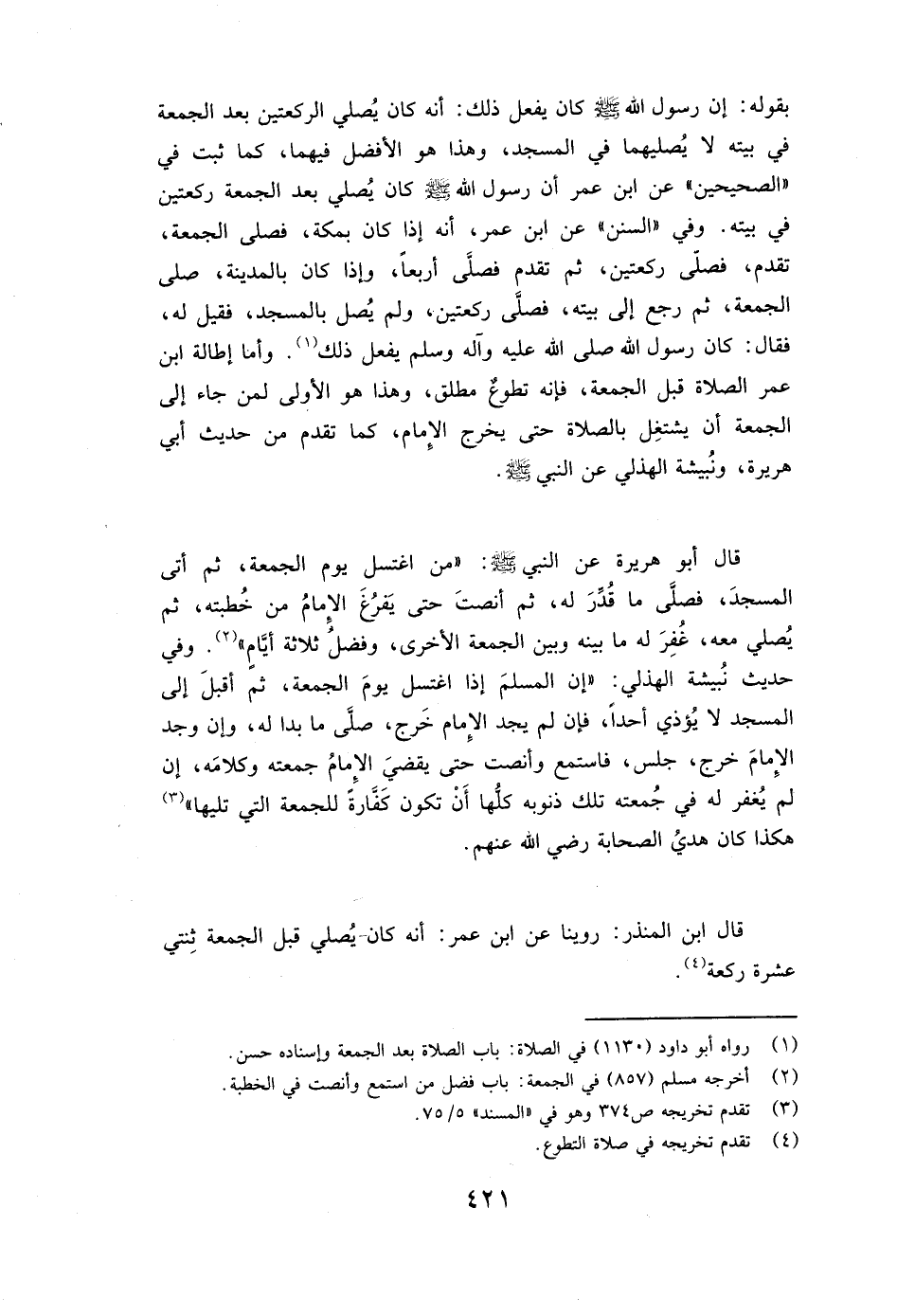 وَفِي " السُّنَنِ " «عَنِ ابْنِ عُمَرَ أَنَّهُ إِذَا كَانَ بِمَكَّةَ فَصَلَّى الْجُمُعَةَ تَقَدَّمَ فَصَلَّى رَكْعَتَيْنِ، ثُمَّ تَقَدَّمَ فَصَلَّى أَرْبَعًا، وَإِذَا كَانَ بِالْمَدِينَةِ صَلَّى الْجُمُعَةَ ثُمَّ رَجَعَ إِلَى بَيْتِهِ فَصَلَّى رَكْعَتَيْنِ وَلَمْ يُصَلِّ بِالْمَسْجِدِ، فَقِيلَ لَهُ فَقَالَ: كَانَ رَسُولُ اللَّهِ صَلَّى اللهُ عَلَيْهِ وَآلِهِ وَسَلَّمَ يَفْعَلُ ذَلِكَ» .