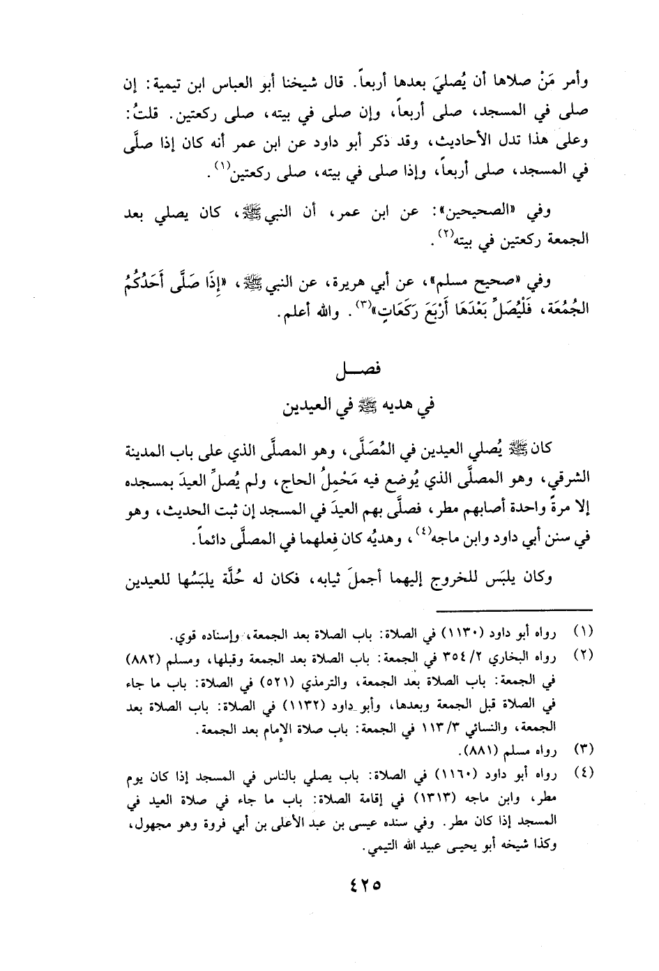 كَانَ صَلَّى اللَّهُ عَلَيْهِ وَسَلَّمَ يُصَلِّي الْعِيدَيْنِ فِي الْمُصَلَّى، وَهُوَ الْمُصَلَّى الَّذِي عَلَى بَابِ الْمَدِينَةِ الشَّرْقِيِّ، وَهُوَ الْمُصَلَّى الَّذِي يُوضَعُ فِيهِ مَحْمِلُ الْحَاجِّ، وَلَمْ يُصَلِّ الْعِيدَ بِمَسْجِدِهِ إِلَّا مَرَّةً وَاحِدَةً أَصَابَهُمْ مَطَرٌ فَصَلَّى بِهِمُ الْعِيدَ فِي الْمَسْجِدِ إِنْ ثَبَتَ الْحَدِيثُ، وَهُوَ فِي سُنَنِ أبي داود، وَابْنِ مَاجَهْ، وَهَدْيُهُ كَانَ فِعْلَهُمَا فِي الْمُصَلَّى دَائِمًا.