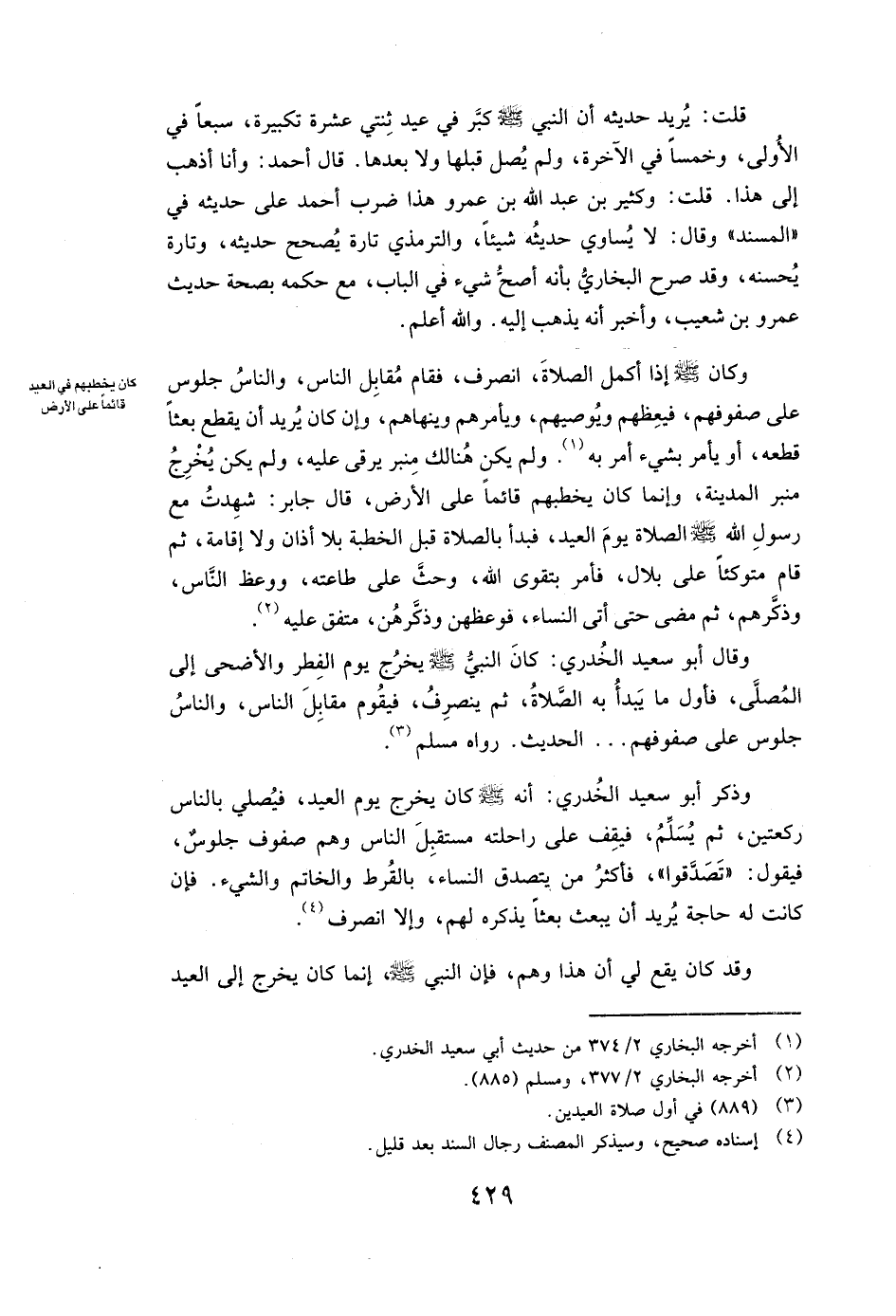 وَقَالَ أَبُو سَعِيدٍ الْخُدْرِيُّ: كَانَ النَّبِيُّ صَلَّى اللَّهُ عَلَيْهِ وَسَلَّمَ يَخْرُجُ يَوْمَ الْفِطْرِ وَالْأَضْحَى إِلَى الْمُصَلَّى، فَأَوَّلُ مَا يَبْدَأُ بِهِ الصَّلَاةُ، ثُمَّ يَنْصَرِفُ فَيَقُومُ مُقَابِلَ النَّاسِ وَالنَّاسُ جُلُوسٌ عَلَى صُفُوفِهِمْ. . . الْحَدِيثَ. رَوَاهُ مسلم.