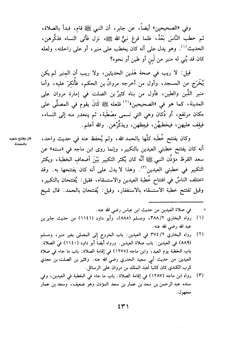 وَفِي " الصَّحِيحَيْنِ " أَيْضًا عَنْ جابر «أَنَّ النَّبِيَّ صَلَّى اللَّهُ عَلَيْهِ وَسَلَّمَ قَامَ فَبَدَأَ بِالصَّلَاةِ، ثُمَّ خَطَبَ النَّاسَ بَعْدُ، فَلَمَّا فَرَغَ نَبِيُّ اللَّهِ صَلَّى اللَّهُ عَلَيْهِ وَسَلَّمَ نَزَلَ فَأَتَى النِّسَاءَ فَذَكَّرَهُنَّ» ، الْحَدِيثَ. وَهُوَ يَدُلُّ عَلَى أَنَّهُ كَانَ يَخْطُبُ عَلَى مِنْبَرٍ، أَوْ عَلَى رَاحِلَتِهِ، وَلَعَلَّهُ كَانَ قَدْ بُنِيَ لَهُ مِنْبَرٌ مِنْ لَبِنٍ أَوْ طِينٍ أَوْ نَحْوِهِ؟ قِيلَ: لَا رَيْبَ فِي صِحَّةِ هَذَيْنِ الْحَدِيثَيْنِ، وَلَا رَيْبَ أَنَّ الْمِنْبَرَ لَمْ يَكُنْ يَخْرُجُ مِنَ الْمَسْجِدِ، وَأَوَّلُ مَنْ أَخْرَجَهُ مَرْوَانُ بْنُ الْحَكَمِ، فَأَنْكَرَ عَلَيْهِ، وَأَمَّا مِنْبَرُ اللَّبِنِ وَالطِّينِ فَأَوَّلُ مَنْ بَنَاهُ كثير بن الصلت فِي إِمَارَةِ مروان عَلَى الْمَدِينَةِ، كَمَا هُوَ فِي " الصِّحِيحَيْنِ " فَلَعَلَّهُ صَلَّى اللَّهُ عَلَيْهِ وَسَلَّمَ كَانَ يَقُومُ فِي الْمُصَلَّى عَلَى مَكَانٍ مُرْتَفِعٍ أَوْ دُكَّانٍ وَهِيَ الَّتِي تُسَمَّى مِصْطَبَةً، ثُمَّ يَنْحَدِرُ مِنْهُ إِلَى النِّسَاءِ فَيَقِفُ عَلَيْهِنَّ فَيَخْطُبُهُنَّ فَيَعِظُهُنَّ وَيُذَكِّرُهُنَّ. وَاللُّهُ أَعْلَمُ.