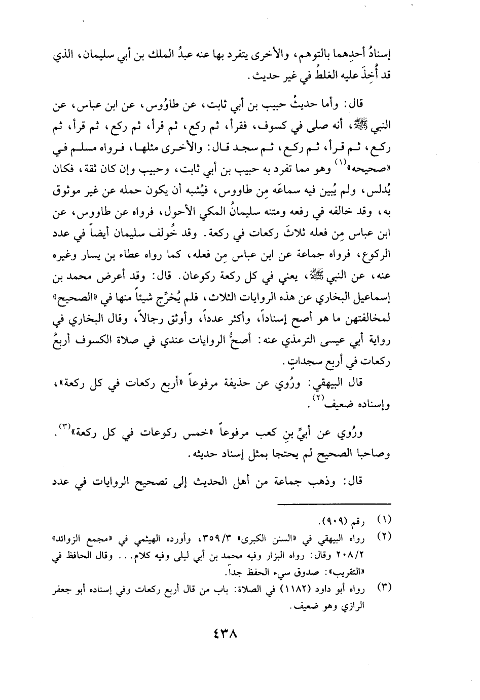 قَالَ: وَأَمَّا حَدِيثُ حَبِيبِ بْنِ أَبِي ثَابِتٍ، عَنْ طَاوُوسٍ، عَنِ ابْنِ عَبَّاسٍ، عَنِ النَّبِيِّ صَلَّى اللَّهُ عَلَيْهِ وَسَلَّمَ أَنَّهُ: ( «صَلَّى فِي كُسُوفٍ، فَقَرَأَ، ثُمَّ رَكَعَ، ثُمَّ قَرَأَ، ثُمَّ رَكَعَ، ثُمَّ قَرَأَ، ثُمَّ رَكَعَ، ثُمَّ قَرَأَ، ثُمَّ رَكَعَ، ثُمَّ سَجَدَ» ) قَالَ: وَالْأُخْرَى مِثْلُهَا، فَرَوَاهُ مسلم فِي " صَحِيحِهِ " وَهُوَ مِمَّا تَفَرَّدَ بِهِ حَبِيبُ بْنُ أَبِي ثَابِتٍ، وحبيب وَإِنْ كَانَ ثِقَةً، فَكَانَ يُدَلِّسُ وَلَمْ يُبَيِّنْ فِيهِ سَمَاعَهُ مِنْ طَاوُوسٍ فَيُشْبِهُ أَنْ يَكُونَ حَمَلَهُ عَنْ غَيْرِ مَوْثُوقٍ بِهِ، وَقَدْ خَالَفَهُ فِي رَفْعِهِ وَمَتْنِهِ سليمان المكي الأحول، فَرَوَاهُ عَنْ طَاوُوسٍ، عَنِ ابْنِ عَبَّاسٍ مِنْ فِعْلِهِ ثَلَاثَ رَكَعَاتٍ فِي رَكْعَةٍ.