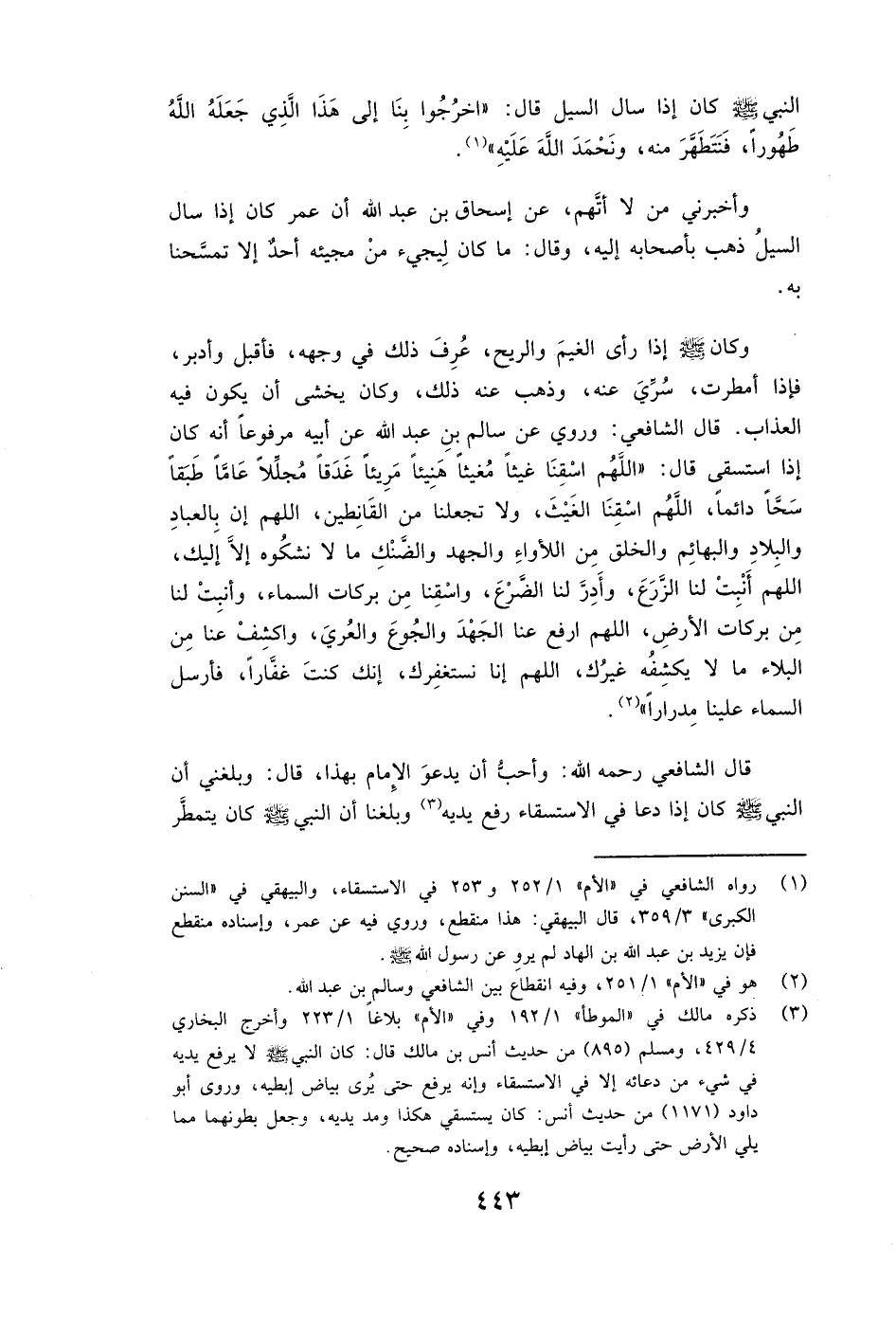قَالَ الشَّافِعِيُّ: وَرُوِيَ «عَنْ سَالِمِ بْنِ عَبْدِ اللَّهِ، عَنْ أَبِيهِ مَرْفُوعًا أَنَّهُ كَانَ إِذَا اسْتَسْقَى قَالَ: (اللَّهُمَّ اسْقِنَا غَيْثًا مُغِيثًا هَنِيئًا مَرِيئًا غَدَقًا مُجَلِّلًا عَامًّا طَبَقًا سَحًّا دَائِمًا، اللَّهُمَّ اسْقِنَا الْغَيْثَ وَلَا تَجْعَلْنَا مِنَ الْقَانِطِينَ، اللَّهُمَّ إِنَّ بِالْعِبَادِ وَالْبِلَادِ وَالْبَهَائِمِ وَالْخَلْقِ مِنَ اللَّأَوَاءِ وَالْجَهْدِ وَالضَّنْكِ مَا لَا نَشْكُوهُ إِلَّا إِلَيْكَ، اللَّهُمَّ أَنْبِتْ لَنَا الزَّرْعَ، وَأَدِرَّ لَنَا الضَّرْعَ، وَاسْقِنَا مِنْ بَرَكَاتِ السَّمَاءِ، وَأَنْبِتْ لَنَا مِنْ بَرَكَاتِ الْأَرْضِ، اللَّهُمَّ ارْفَعْ عَنَّا الْجَهْدَ وَالْجُوعَ وَالْعُرْيَ، وَاكْشِفْ عَنَّا مِنَ الْبَلَاءِ مَا لَا يَكْشِفُهُ غَيْرُكُ، اللَّهُمَّ إِنَّا نَسْتَغْفِرُكُ إِنَّكَ كُنْتَ غَفَّارًا، فَأَرْسِلِ السَّمَاءَ عَلَيْنَا مِدْرَارًا» )