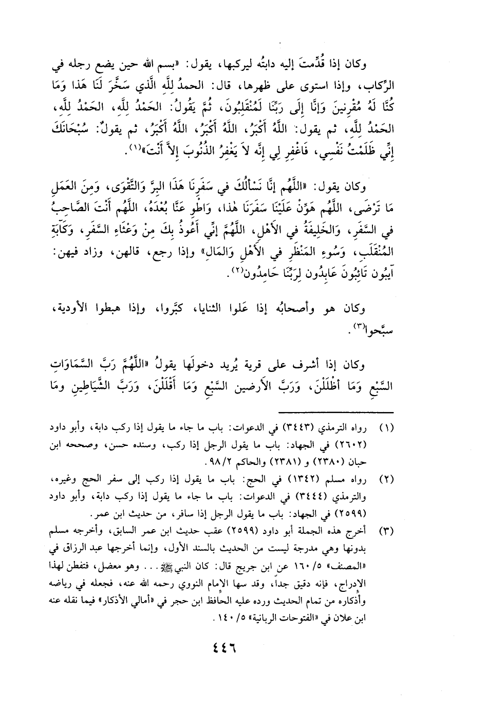 ( «وَكَانَ إِذَا قَدِمَتْ إِلَيْهِ دَابَّتُهُ لِيَرْكَبَهَا، يَقُولُ بِسْمِ اللَّهِ حِينَ يَضَعُ رِجْلَهُ فِي الرِّكَابِ، وَإِذَا اسْتَوَى عَلَى ظَهْرِهَا، قَالَ: الْحَمْدُ لِلَّهِ الَّذِي سَخَّرَ لَنَا هَذَا وَمَا كُنَّا لَهُ مُقْرِنِينَ، وَإِنَّا إِلَى رَبِّنَا لَمُنْقَلِبُونَ، ثُمَّ يَقُولُ: الْحَمْدُ لِلَّهِ، الْحَمْدُ لِلَّهِ، الْحَمْدُ لِلَّهِ، ثُمَّ يَقُولُ: اللَّهُ أَكْبَرُ، اللَّهُ أَكْبَرُ، اللَّهُ أَكْبَرُ، ثُمَّ يَقُولُ: سُبْحَانَكَ إِنِّي ظَلَمْتُ نَفْسِي فَاغْفِرْ لِي، إِنَّهُ لَا يَغْفِرُ الذُّنُوبَ إِلَّا أَنْتَ» )