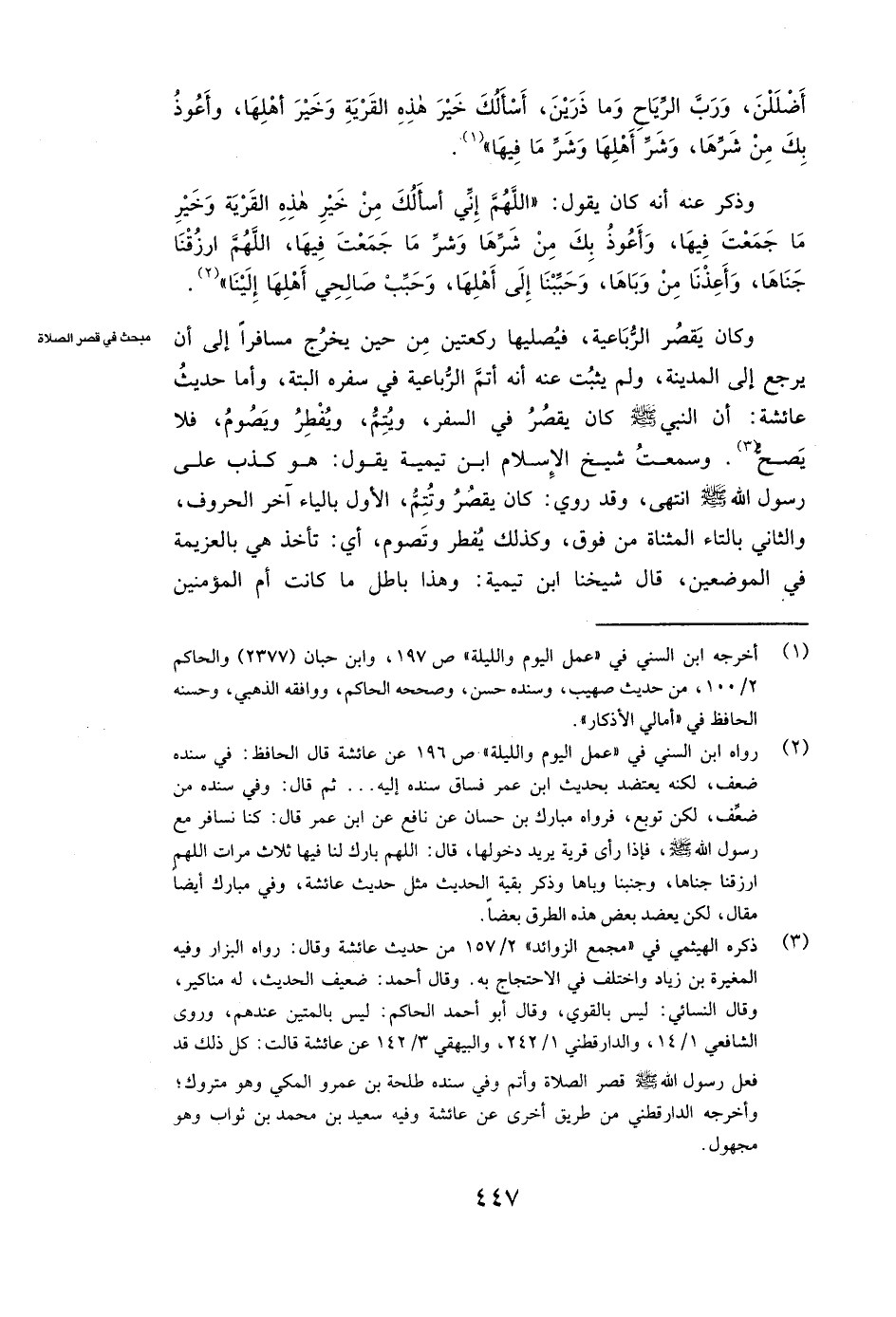 وَكَانَ يَقْصُرُ الرُّبَاعِيَّةَ، فَيُصَلِّيهَا رَكْعَتَيْنِ مِنْ حِينِ يَخْرُجُ مُسَافِرًا إِلَى أَنْ يَرْجِعَ إِلَى الْمَدِينَةِ، وَلَمْ يَثْبُتْ عَنْهُ أَنَّهُ أَتَمَّ الرُّبَاعِيَّةَ فِي سَفَرِهِ الْبَتَّةَ، وَأَمَّا حَدِيثُ عائشة: أَنَّ النَّبِيَّ صَلَّى اللَّهُ عَلَيْهِ وَسَلَّمَ ( «كَانَ يَقْصُرُ فِي السَّفَرِ، وَيُتِمُّ، وَيُفْطِرُ، وَيَصُومُ» ) فَلَا يَصِحَّ. وَسَمِعْتُ شَيْخَ الْإِسْلَامِ ابْنَ تَيْمِيَّةَ يَقُولُ: هُوَ كَذِبٌ عَلَى رَسُولِ اللَّهِ صَلَّى اللَّهُ عَلَيْهِ وَسَلَّمَ انْتَهَى، وَقَدْ رُوِيَ كَانَ يَقْصُرُ وَتُتِمُّ، الْأَوَّلُ بِالْيَاءِ آخِرِ الْحُرُوفِ، وَالثَّانِي بِالتَّاءِ الْمُثَنَّاةِ مِنْ فَوْقٍ، وَكَذَلِكَ يُفْطِرُ وَتَصُومُ، أَيْ: تَأْخُذُ هِيَ بِالْعَزِيمَةِ فِي الْمَوْضِعَيْنِ، قَالَ: شَيْخُنَا ابن تيمية: وَهَذَا بَاطِلٌ مَا كَانَتْ أُمُّ الْمُؤْمِنِينَ
