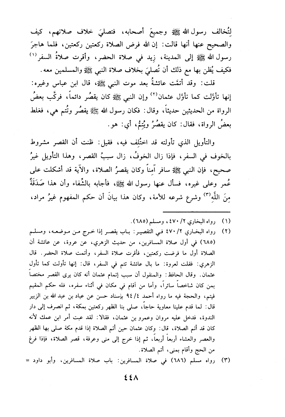 لِتُخَالِفَ رَسُولَ اللَّهِ صَلَّى اللَّهُ عَلَيْهِ وَسَلَّمَ وَجَمِيعَ أَصْحَابِهِ، فَتُصَلِّيَ خِلَافَ صَلَاتِهِمْ، كَيْفَ وَالصَّحِيحُ عَنْهَا أَنَّهَا قَالَتْ: ( «إِنَّ اللَّهَ فَرَضَ الصَّلَاةَ رَكْعَتَيْنِ رَكْعَتَيْنِ، فَلَمَّا هَاجَرَ رَسُولُ اللَّهِ صَلَّى اللَّهُ عَلَيْهِ وَسَلَّمَ إِلَى الْمَدِينَةِ، زِيدَ فِي صَلَاةِ الْحَضَرِ، وَأُقِرَّتْ صَلَاةُ السَّفَرِ» ) فَكَيْفَ يُظَنُّ بِهَا مَعَ ذَلِكَ أَنْ تُصَلِّيَ بِخِلَافِ صَلَاةِ النَّبِيِّ صَلَّى اللَّهُ عَلَيْهِ وَسَلَّمَ وَالْمُسْلِمِينَ مَعَهُ.
