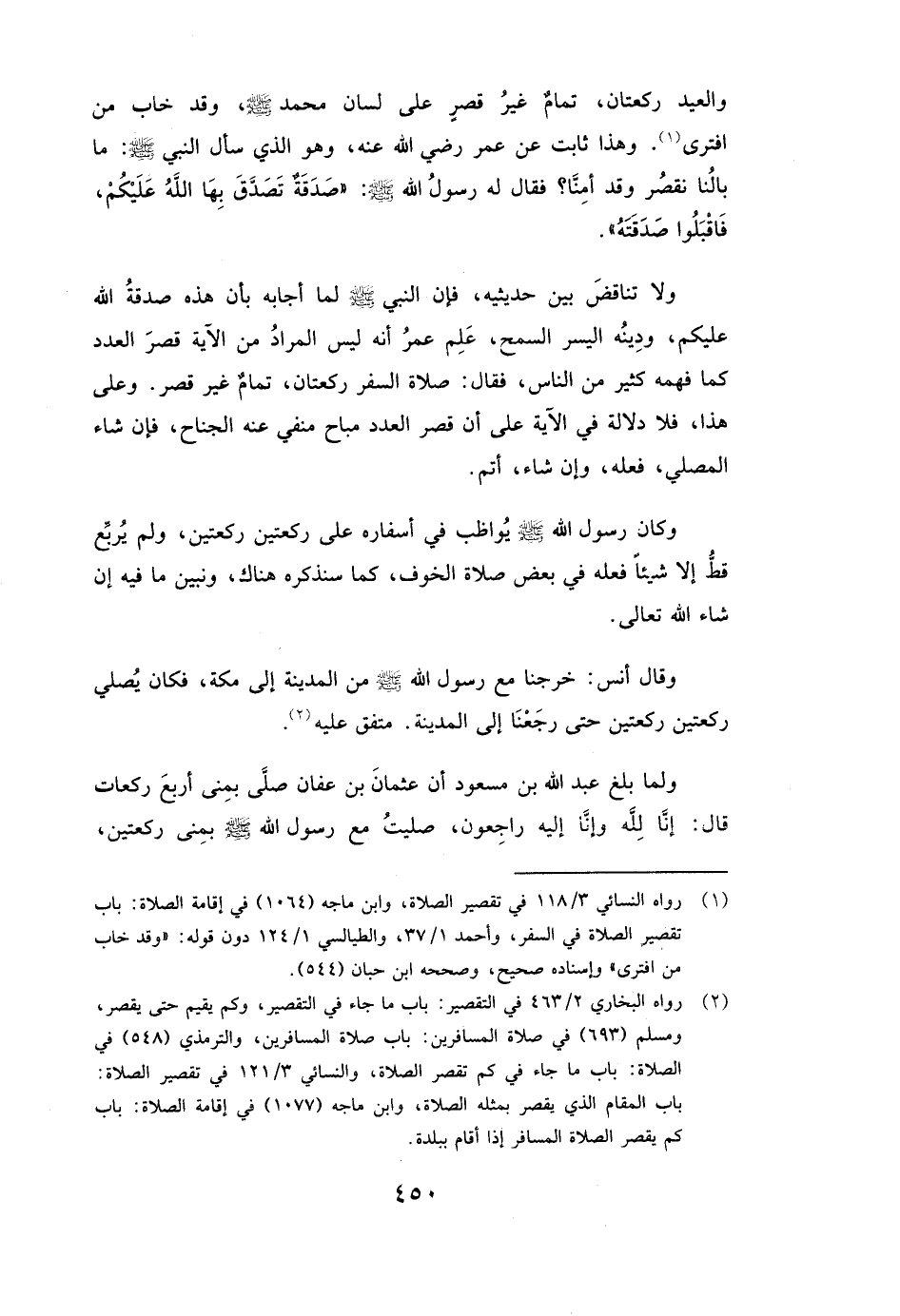 ( «وَلَمَّا بَلَغَ عَبْدَ اللَّهِ بْنَ مَسْعُودٍ أَنَّ عُثْمَانَ بْنَ عَفَّانَ صَلَّى بِمِنًى أَرْبَعَ رَكَعَاتٍ قَالَ: إِنَّا لِلَّهِ وَإِنَّا إِلَيْهِ رَاجِعُونَ، صَلَّيْتُ مَعَ رَسُولِ اللَّهِ صَلَّى اللَّهُ عَلَيْهِ وَسَلَّمَ بِمِنًى رَكْعَتَيْنِ،