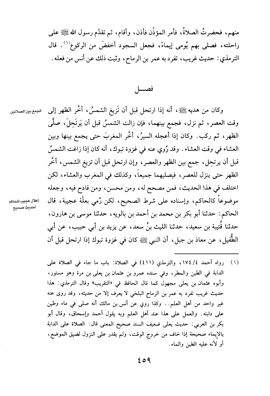 وَقَدْ رُوِيَ عَنْهُ فِي غَزْوَةِ تَبُوكَ أَنَّهُ كَانَ إِذَا زَاغَتِ الشَّمْسُ قَبْلَ أَنْ يَرْتَحِلَ جَمَعَ بَيْنَ الظُّهْرِ وَالْعَصْرِ، وَإِنِ ارْتَحَلَ قَبْلَ أَنْ تَزِيغَ الشَّمْسُ أَخَّرَ الظُّهْرَ حَتَّى يَنْزِلَ لِلْعَصْرِ فَيُصَلِّيَهُمَا جَمِيعًا، وَكَذَلِكَ فِي الْمَغْرِبِ وَالْعِشَاءِ، لَكِنِ اخْتُلِفَ فِي هَذَا الْحَدِيثِ، فَمِنْ مُصَحِّحٍ لَهُ، وَمِنْ مُحَسِّنٍ، وَمِنْ قَادِحٍ فِيهِ، وَجَعْلِهِ مَوْضُوعًا كالحاكم، وَإِسْنَادُهُ عَلَى شَرْطِ الصَّحِيحِ، لَكِنْ رُمِيَ بِعِلَّةٍ عَجِيبَةٍ، قَالَ الحاكم: حَدَّثَنَا أَبُو بَكْرِ بْنُ مُحَمَّدِ بْنِ أَحْمَدَ بْنِ بَالَوَيْهِ، حَدَّثَنَا مُوسَى بْنُ هَارُونَ، حَدَّثَنَا قُتَيْبَةُ بْنُ سَعِيدٍ، حَدَّثَنَا اللَّيْثُ بْنُ سَعْدٍ، عَنْ يَزِيدَ بْنِ أَبِي حَبِيبٍ، عَنْ أبي الطفيل، عَنْ مُعَاذِ بْنِ جَبَلٍ أَنَّ النَّبِيَّ صَلَّى اللَّهُ عَلَيْهِ وَسَلَّمَ ( «كَانَ فِي غَزْوَةِ تَبُوكَ إِذَا ارْتَحَلَ قَبْلَ أَنْ