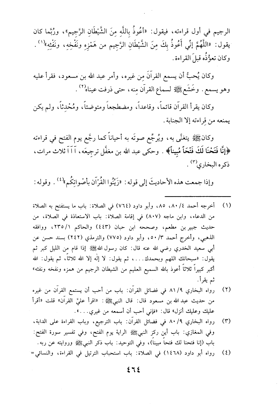 وَكَانَ صَلَّى اللَّهُ عَلَيْهِ وَسَلَّمَ يَتَغَنَّى بِهِ، وَيُرَجِّعُ صَوْتَهُ بِهِ أَحْيَانًا كَمَا رَجَّعَ يَوْمَ الْفَتْحِ فِي قِرَاءَتِهِ {إِنَّا فَتَحْنَا لَكَ فَتْحًا مُبِينًا} [الفتح: 1] . وَحَكَى عَبْدُ اللَّهِ بْنُ مُغَفَّلٍ تَرْجِيعَهُ، آآ آثَلَاثَ مَرَّاتٍ ذَكَرَهُ الْبُخَارِيُّ.