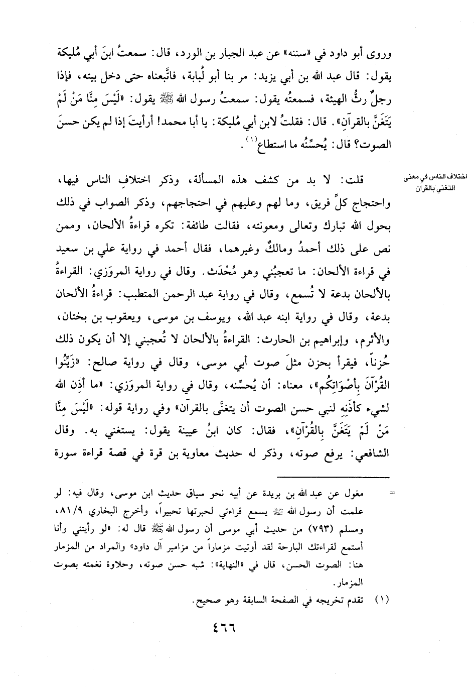 قُلْتُ: لَا بُدَّ مِنْ كَشْفِ هَذِهِ الْمَسْأَلَةِ وَذِكْرِ اخْتِلَافِ النَّاسِ فِيهَا، وَاحْتِجَاجِ كُلِّ فَرِيقٍ، وَمَا لَهُمْ وَعَلَيْهِمْ فِي احْتِجَاجِهِمْ، وَذِكْرِ الصُّوَابِ فِي ذَلِكَ بِحَوْلِ اللَّهِ تَبَارَكَ وَتَعَالَى وَمَعُونَتِهِ، فَقَالَتْ طَائِفَةٌ: تُكْرَهُ قِرَاءَةُ الْأَلْحَانِ، وَمِمَّنْ نَصَّ عَلَى ذَلِكَ أحمد، ومالك وَغَيْرُهُمَا، فَقَالَ أحمد فِي رِوَايَةِ علي بن سعيد فِي قِرَاءَةِ الْأَلْحَانِ: مَا تُعْجِبُنِي وَهُوَ مُحْدَثٌ. وَقَالَ فِي رِوَايَةِ المروزي: الْقِرَاءَةُ بِالْأَلْحَانِ بِدْعَةٌ لَا تُسْمَعُ، وَقَالَ فِي رِوَايَةِ عبد الرحمن المتطبب: قِرَاءَةُ الْأَلْحَانِ بِدْعَةٌ، وَقَالَ فِي رِوَايَةِ ابْنِهِ عبد الله، وَيُوسُفَ بْنِ مُوسَى، ويعقوب بن بختان، والأثرم، وإبراهيم بن الحارث: الْقِرَاءَةُ بِالْأَلْحَانِ لَا تُعْجِبُنِي إِلَّا أَنْ يَكُونَ ذَلِكَ حُزْنًا فَيَقْرَأُ بِحُزْنٍ مِثْلَ صَوْتِ أبي موسى، وَقَالَ فِي رِوَايَةِ صالح ( «زَيِّنُوا الْقُرْآنَ بِأَصْوَاتِكُمْ» ) مَعْنَاهُ أَنْ يُحَسِّنَهُ وَقَالَ فِي رِوَايَةِ المروزي: ( «مَا أَذِنَ اللَّهُ لِشَيْءٍ كَإِذْنِهِ لِنَبِيٍّ حَسَنِ الصَّوْتِ أَنْ يَتَغَنَّى بِالْقُرْآنِ» ) ، وَفِي رِوَايَةٍ قَوْلُهُ: ( «لَيْسَ مِنَّا مَنْ لَمْ يَتَغَنَّ بِالْقُرْآنِ» ) ، فَقَالَ كَانَ ابْنُ عُيَيْنَةَ يَقُولُ: يَسْتَغْنِي بِهِ. وَقَالَ الشَّافِعِيُّ: يَرْفَعُ صَوْتَهُ، وَذَكَرَ لَهُ حَدِيثَ مُعَاوِيَةَ بْنِ قُرَّةَ فِي قِصَّةِ قِرَاءَةِ سُورَةِ