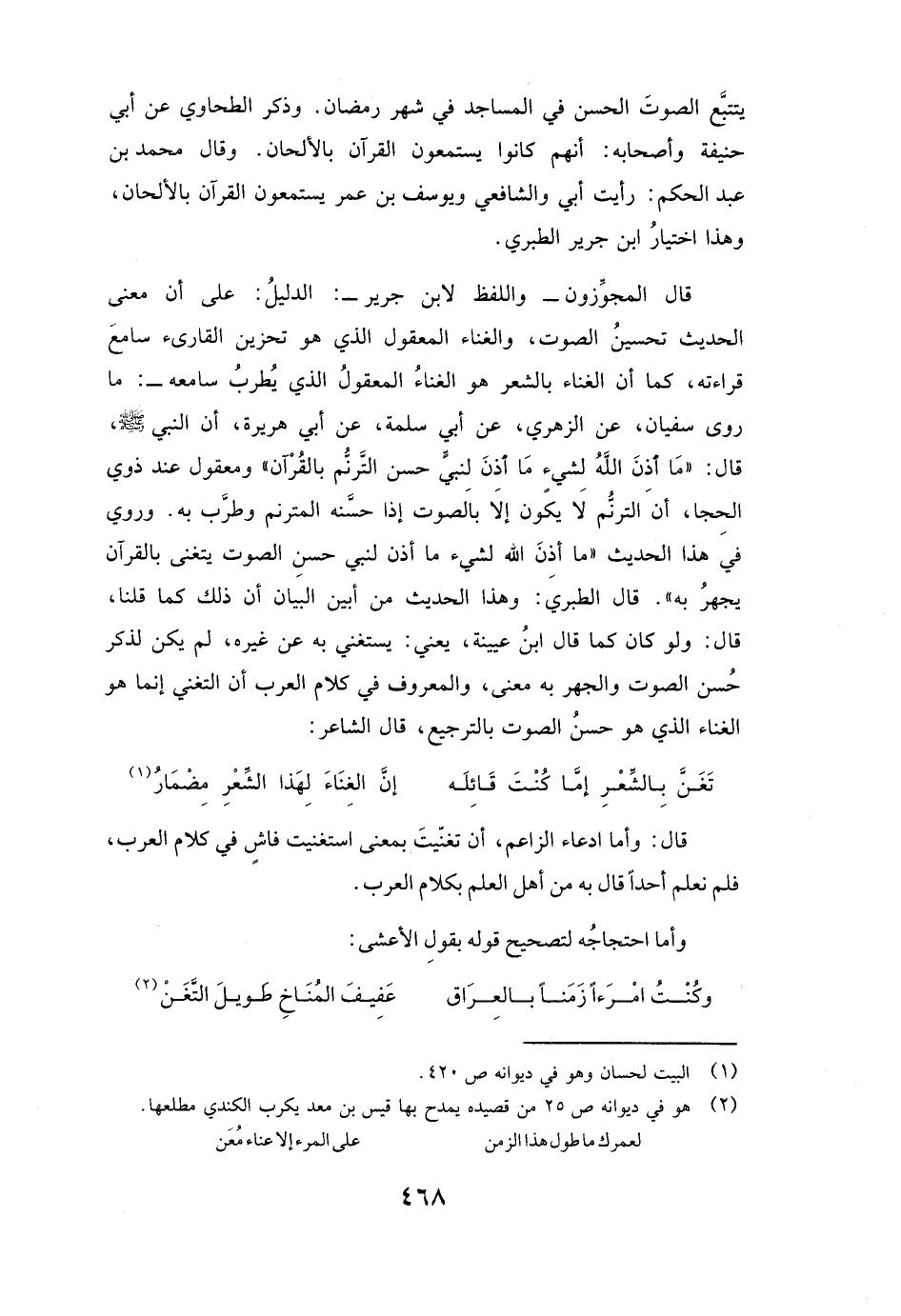 قَالَ الْمُجَوِّزُونَ - وَاللَّفْظُ لِابْنِ جَرِيرٍ -: الدَّلِيلُ: عَلَى أَنَّ مَعْنَى الْحَدِيثِ تَحْسِينُ الصَّوْتِ، وَالْغِنَاءُ الْمَعْقُولُ الَّذِي هُوَ تَحْزِينُ الْقَارِئِ سَامِعَ قِرَاءَتِهِ، كَمَا أَنَّ الْغِنَاءَ بِالشِّعْرِ هُوَ الْغِنَاءُ الْمَعْقُولُ الَّذِي يُطْرِبُ سَامِعَهُ -: مَا رَوَى سفيان، عَنِ الزُّهْرِيِّ، عَنْ أبي سلمة، عَنْ أَبِي هُرَيْرَةَ، أَنَّ النَّبِيَّ صَلَّى اللَّهُ عَلَيْهِ وَسَلَّمَ، قَالَ: ( «مَا أَذِنَ اللَّهُ لِشَيْءٍ مَا أَذِنَ لِنَبِيٍّ حَسَنِ التَّرَنُّمِ بِالْقُرْآنِ» ) وَمَعْقُولٌ عِنْدَ ذَوِي الْحِجَا، أَنَّ التَّرَنُّمَ لَا يَكُونُ إِلَّا بِالصَّوْتِ إِذَا حَسَّنَهُ الْمُتَرَنِّمُ وَطَرَّبَ بِهِ. وَرُوِيَ فِي هَذَا الْحَدِيثِ ( «مَا أَذِنَ اللَّهُ لِشَيْءٍ مَا أَذِنَ لِنَبِيٍّ حَسَنِ الصَّوْتِ يَتَغَنَّى بِالْقُرْآنِ يَجْهَرُ بِهِ» ) قَالَ الطَّبَرِيُّ: وَهَذَا الْحَدِيثُ مِنْ أَبْيَنِ الْبَيَانِ أَنَّ ذَلِكَ كَمَا قُلْنَا، قَالَ وَلَوْ كَانَ كَمَا قَالَ ابْنُ عُيَيْنَةَ يَعْنِي: يَسْتَغْنِي بِهِ عَنْ غَيْرِهِ لَمْ يَكُنْ لِذِكْرِ حُسْنِ الصَّوْتِ وَالْجَهْرِ بِهِ مَعْنًى، وَالْمَعْرُوفُ فِي كَلَامِ الْعَرَبِ أَنَّ التَّغَنِّيَ إِنَّمَا هُوَ الْغِنَاءُ الَّذِي هُوَ حُسْنُ الصَّوْتِ بِالتَّرْجِيعِ، قَالَ الشَّاعِرُ