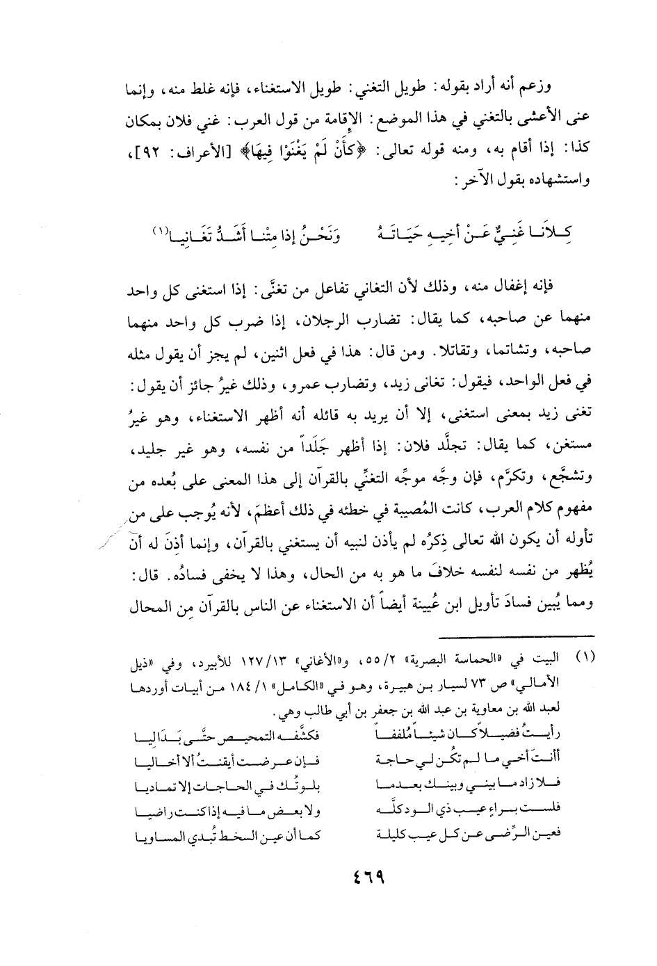 فَإِنَّهُ إِغْفَالٌ مِنْهُ، وَذَلِكَ لِأَنَّ التَّغَانِيَ تَفَاعُلٌ مِنْ تَغَنَّى: إِذَا اسْتَغْنَى كُلُّ وَاحِدٍ مِنْهُمَا عَنْ صَاحِبِهِ، كَمَا يُقَالُ تَضَارَبَ الرَّجُلَانِ، إِذَا ضَرَبَ كُلُّ وَاحِدٍ مِنْهُمَا صَاحِبَهُ، وَتَشَاتَمَا، وَتَقَاتَلَا. وَمَنْ قَالَ: هَذَا فِي فِعْلِ اثْنَيْنِ، لَمْ يَجُزْ أَنْ يَقُولَ مِثْلَهُ فِي فِعْلِ الْوَاحِدِ، فَيَقُولُ: تَغَانَى زَيْدٌ، وَتَضَارَبَ عَمْرٌو، وَذَلِكَ غَيْرُ جَائِزٍ أَنْ يَقُولَ: تَغَنَّى زَيْدٌ بِمَعْنَى اسْتَغْنَى، إِلَّا أَنْ يُرِيدَ بِهِ قَائِلُهُ أَنَّهُ أَظْهَرَ الِاسْتِغْنَاءَ، وَهُوَ غَيْرُ مُسْتَغْنٍ كَمَا يُقَالُ تَجَلَّدَ فُلَانٌ إِذَا أَظْهَرَ جَلَدًا مِنْ نَفْسِهِ، وَهُوَ غَيْرُ جَلِيدٍ، وَتَشَجَّعَ، وَتَكَرَّمَ، فَإِنْ وَجَّهَ مُوَجِّهٌ التَّغَنِّيَ بِالْقُرْآنِ إِلَى هَذَا الْمَعْنَى عَلَى بُعْدِهِ مِنْ مَفْهُومِ كَلَامِ الْعَرَبِ، كَانَتِ الْمُصِيبَةُ فِي خَطَئِهِ فِي ذَلِكَ أَعْظَمَ لِأَنَّهُ يُوجِبُ عَلَى مَنْ تَأَوَّلَهُ أَنْ يَكُونَ اللَّهُ تَعَالَى ذِكْرُهُ لَمْ يَأْذَنْ لِنَبِيِّهِ أَنْ يَسْتَغْنِيَ بِالْقُرْآنِ، وَإِنَّمَا أَذِنَ لَهُ أَنْ يُظْهِرَ مِنْ نَفْسِهِ لِنَفْسِهِ خِلَافَ مَا هُوَ بِهِ مِنَ الْحَالِ، وَهَذَا لَا يَخْفَى فَسَادُهُ. قَالَ: وَمِمَّا يُبَيِّنُ فَسَادَ تَأْوِيلِ ابْنِ عُيَيْنَةَ أَيْضًا أَنَّ الِاسْتِغْنَاءَ عَنِ النَّاسِ بِالْقُرْآنِ مِنَ الْمُحَالِ