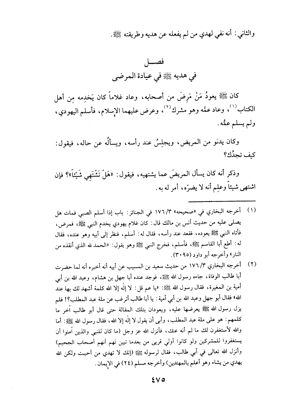 كَانَ صَلَّى اللَّهُ عَلَيْهِ وَسَلَّمَ يَعُودُ مَنْ مَرِضَ مِنْ أَصْحَابِهِ، وَعَادَ غُلَامًا كَانَ يَخْدِمُهُ مِنْ أَهْلِ الْكِتَابِ، وَعَادَ عَمَّهُ وَهُوَ مُشْرِكٌ وَعَرَضَ عَلَيْهِمَا الْإِسْلَامَ فَأَسْلَمَ الْيَهُودِيُّ وَلَمْ يُسْلِمْ عَمُّهُ.