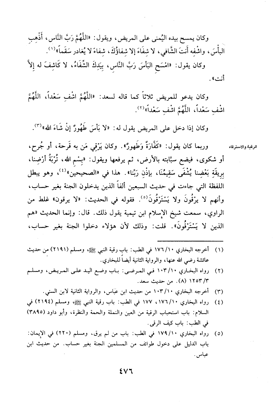 وَرُبَّمَا كَانَ يَقُولُ: (كَفَّارَةٌ وَطَهُورٌ) . وَكَانَ يَرْقِي مَنْ بِهِ قُرْحَةٌ، أَوْ جُرْحٌ أَوْ شَكْوَى، فَيَضَعُ سَبَّابَتَهُ بِالْأَرْضِ، ثُمَّ يَرْفَعُهَا وَيَقُولُ: ( «بِسْمِ اللَّهِ، تُرْبَةُ أَرْضِنَا، بِرِيقَةِ بَعْضِنَا يُشْفَى سَقِيمُنَا بِإِذْنِ رَبِّنَا» ) هَذَا فِي " الصَّحِيحَيْنِ "، وَهُوَ يُبْطِلُ اللَّفْظَةَ الَّتِي جَاءَتْ فِي حَدِيثِ السَّبْعِينَ أَلْفًا الَّذِينَ يَدْخُلُونَ الْجَنَّةَ بِغَيْرِ حِسَابٍ، وَأَنَّهُمْ لَا يَرْقُونَ وَلَا يَسْتَرْقُونَ. فَقَوْلُهُ فِي الْحَدِيثِ " لَا يَرْقُونَ " غَلَطٌ مِنَ الرَّاوِي، سَمِعْتُ شَيْخَ الْإِسْلَامِ ابن تيمية يَقُولُ ذَلِكَ. قَالَ: وَإِنَّمَا الْحَدِيثُ " «هُمُ الَّذِينَ لَا يَسْتَرْقُونَ» ". قُلْتُ: وَذَلِكَ لِأَنَّ هَؤُلَاءِ دَخَلُوا الْجَنَّةَ بِغَيْرِ حِسَابٍ،