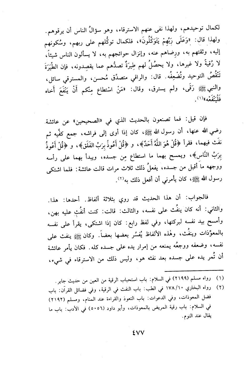 لِكَمَالِ تَوْحِيدِهِمْ، وَلِهَذَا نَفَى عَنْهُمُ الِاسْتِرْقَاءَ، وَهُوَ سُؤَالُ النَّاسِ أَنْ يَرْقُوهُمْ. وَلِهَذَا قَالَ ( «وَعَلَى رَبِّهِمْ يَتَوَكَّلُونَ» ) ، فَلِكَمَالِ تَوَكُّلِهِمْ عَلَى رَبِّهِمْ وَسُكُونِهِمْ إِلَيْهِ، وَثِقَتِهِمْ بِهِ، وَرِضَاهُمْ عَنْهُ، وَإِنْزَالِ حَوَائِجِهِمْ بِهِ لَا يَسْأَلُونَ النَّاسَ شَيْئًا لَا رُقْيَةً وَلَا غَيْرَهَا، وَلَا يَحْصُلُ لَهُمْ طِيَرَةٌ تَصُدُّهُمْ عَمَّا يَقْصِدُونَهُ، فَإِنَّ الطِّيَرَةَ تُنْقِصُ التَّوْحِيدَ وَتُضْعِفُهُ.
