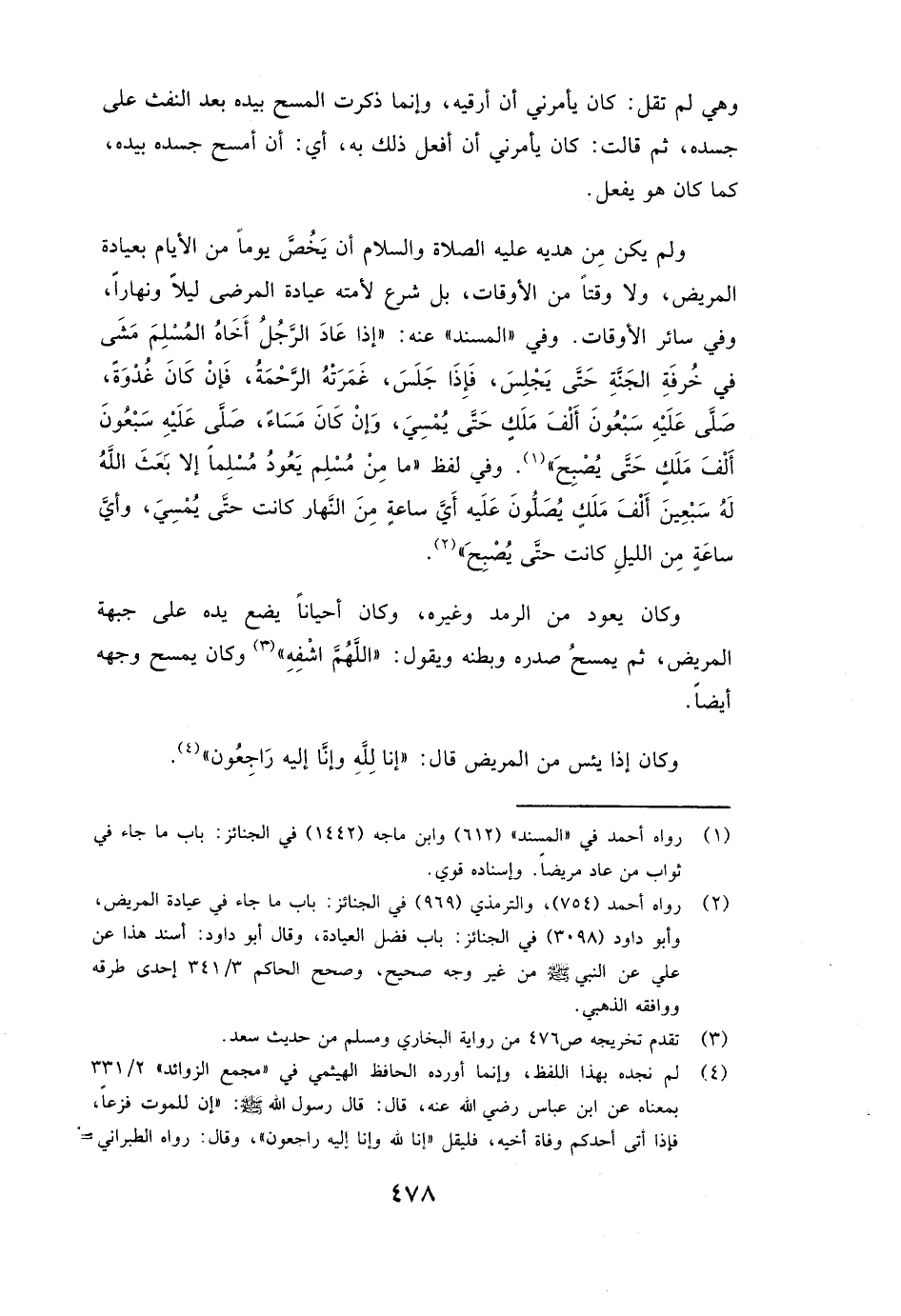 وَكَانَ يَعُودُ مِنَ الرَّمَدِ وَغَيْرِهِ، وَكَانَ أَحْيَانًا يَضَعُ يَدَهُ عَلَى جَبْهَةِ الْمَرِيضِ، ثُمَّ يَمْسَحُ صَدْرَهُ وَبَطْنَهُ وَيَقُولُ (اللَّهُمَّ اشْفِهِ) وَكَانَ يَمْسَحُ وَجْهَهُ أَيْضًا.