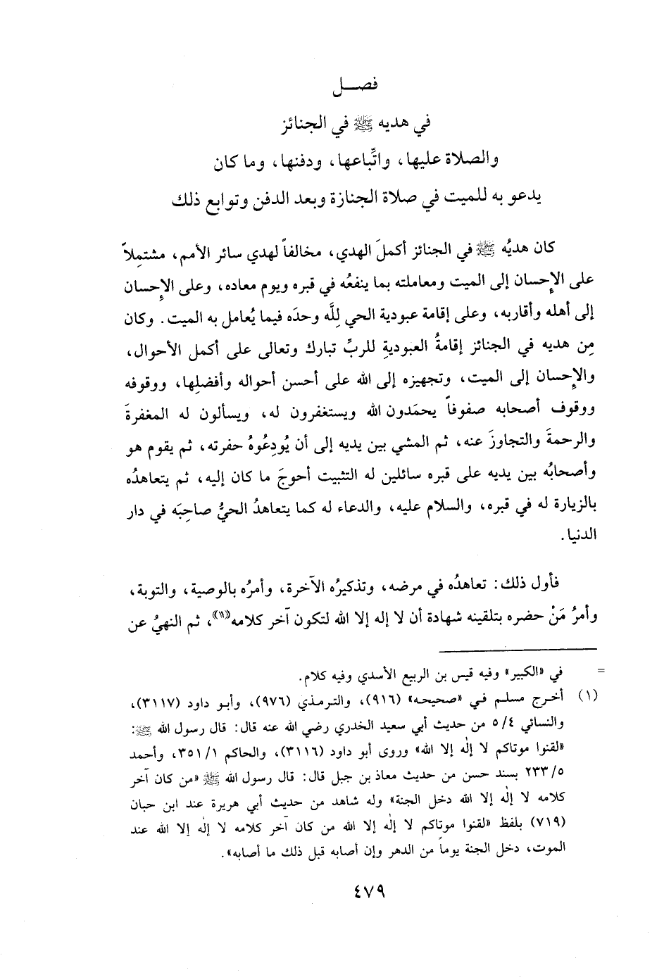 كَانَ هَدْيُهُ صَلَّى اللَّهُ عَلَيْهِ وَسَلَّمَ فِي الْجَنَائِزِ أَكْمَلَ الْهَدْيِ مُخَالِفًا لِهَدْيِ سَائِرِ الْأُمَمِ، مُشْتَمِلًا عَلَى الْإِحْسَانِ إِلَى الْمَيِّتِ وَمُعَامَلَتِهِ بِمَا يَنْفَعُهُ فِي قَبْرِهِ وَيَوْمَ مَعَادِهِ، وَعَلَى الْإِحْسَانِ إِلَى أَهْلِهِ وَأَقَارِبِهِ وَعَلَى إِقَامَةِ عُبُودِيَّةِ الْحَيِّ لِلَّهِ وَحْدَهُ فِيمَا يُعَامِلُ بِهِ الْمَيَّتَ. وَكَانَ مِنْ هَدْيِهِ فِي الْجَنَائِزِ إِقَامَةُ الْعُبُودِيَّةِ لِلرَّبِّ تَبَارَكَ وَتَعَالَى عَلَى أَكْمَلِ الْأَحْوَالِ وَالْإِحْسَانُ إِلَى الْمَيِّتِ، وَتَجْهِيزُهُ إِلَى اللَّهِ عَلَى أَحْسَنِ أَحْوَالِهِ وَأَفْضَلِهَا، وَوُقُوفُهُ وَوُقُوفُ أَصْحَابِهِ صُفُوفًا يَحْمَدُونَ اللَّهَ وَيَسْتَغْفِرُونَ لَهُ، وَيَسْأَلُونَ لَهُ الْمَغْفِرَةَ وَالرَّحْمَةَ وَالتَّجَاوُزَ عَنْهُ، ثُمَّ الْمَشْيُ بَيْنَ يَدَيْهِ إِلَى أَنْ يُودِعُوهُ حُفْرَتَهُ، ثُمَّ يَقُومُ هُوَ وَأَصْحَابُهُ بَيْنَ يَدَيْهِ عَلَى قَبْرِهِ سَائِلِينَ لَهُ التَّثْبِيتَ أَحْوَجَ مَا كَانَ إِلَيْهِ، ثُمَّ يَتَعَاهَدُهُ بِالزِّيَارَةِ لَهُ فِي قَبْرِهِ، وَالسَّلَامِ عَلَيْهِ، وَالدُّعَاءِ لَهُ كَمَا يَتَعَاهَدُ الْحَيُّ صَاحِبَهُ فِي دَارِ الدُّنْيَا.