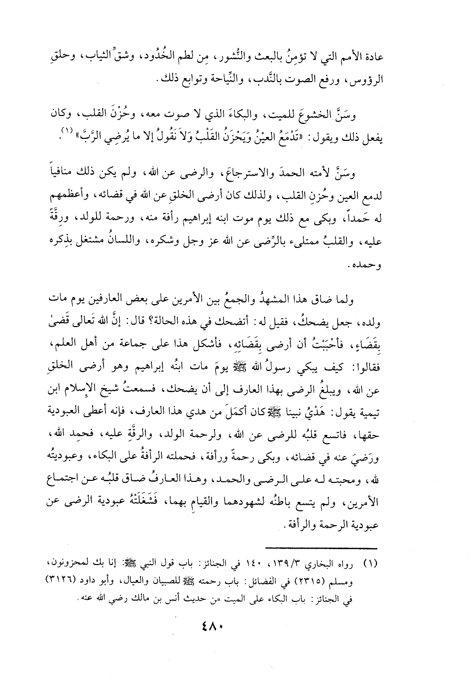 وَسَنَّ لِأُمَّتِهِ الْحَمْدَ وَالِاسْتِرْجَاعَ، وَالرِّضَى عَنِ اللَّهِ، وَلَمْ يَكُنْ ذَلِكَ مُنَافِيًا لِدَمْعِ الْعَيْنِ وَحُزْنِ الْقَلْبِ، وَلِذَلِكَ كَانَ أَرْضَى الْخَلْقِ عَنِ اللَّهِ فِي قَضَائِهِ، وَأَعْظَمَهُمْ لَهُ حَمْدًا، وَبَكَى مَعَ ذَلِكَ يَوْمَ مَوْتِ ابْنِهِ إِبْرَاهِيمَ رَأْفَةً مِنْهُ، وَرَحْمَةً لِلْوَلَدِ، وَرِقَّةً عَلَيْهِ، وَالْقَلْبُ مُمْتَلِئٌ بِالرِّضَى، عَنِ اللَّهِ عَزَّ وَجَلَّ وَشُكْرِهِ، وَاللِّسَانُ مُشْتَغِلٌ بِذِكْرِهِ وَحَمْدِهِ.