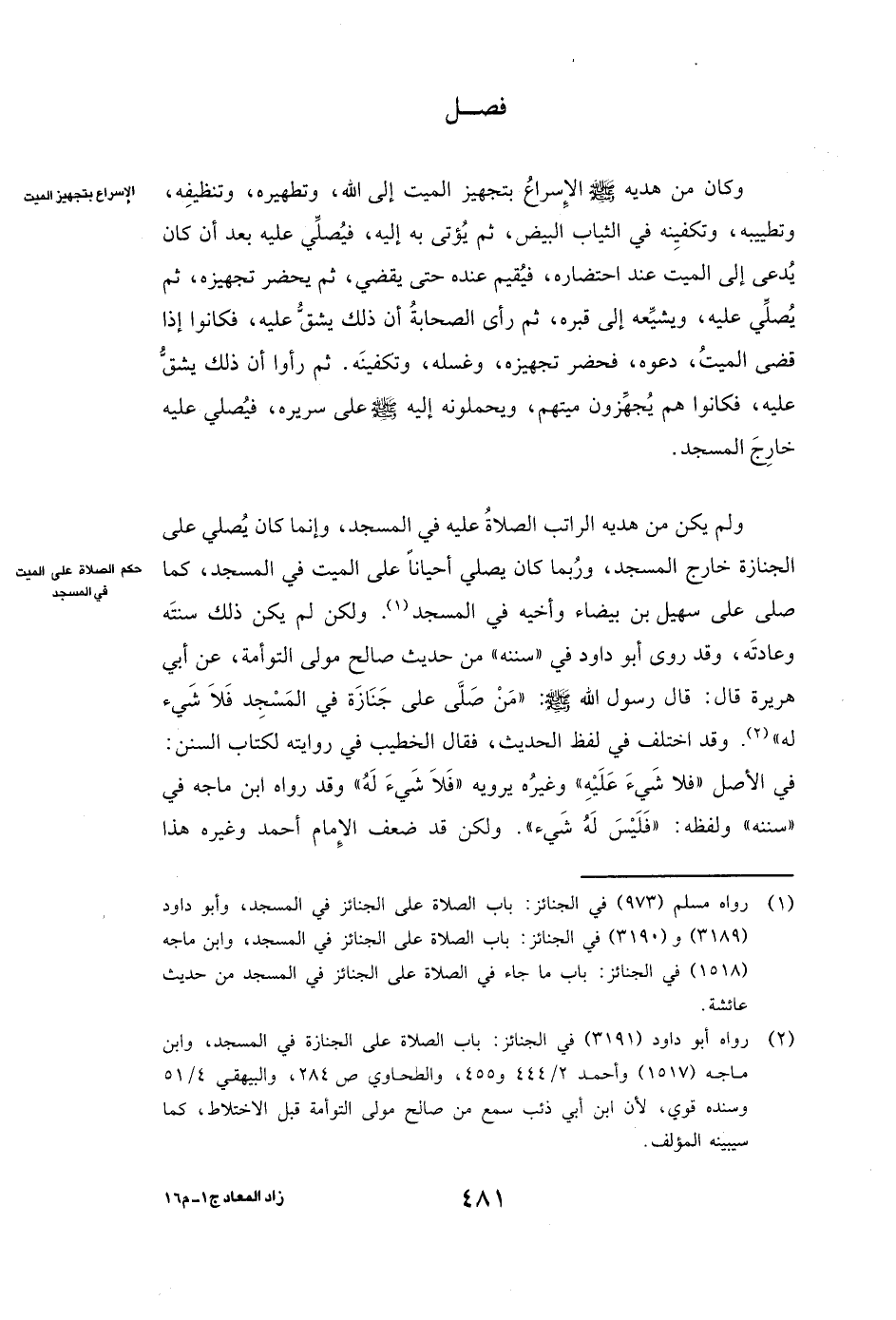 وَكَانَ مِنْ هَدْيِهِ - صَلَّى اللَّهُ عَلَيْهِ وَسَلَّمَ - الْإِسْرَاعُ بِتَجْهِيزِ الْمَيِّتِ إِلَى اللَّهِ، وَتَطْهِيرُهُ وَتَنْظِيفُهُ وَتَطْيِيبُهُ وَتَكْفِينُهُ فِي الثِّيَابِ الْبِيضِ، ثُمَّ يُؤْتَى بِهِ إِلَيْهِ فَيُصَلِّي عَلَيْهِ بَعْدَ أَنْ كَانَ يُدْعَى إِلَى الْمَيِّتِ عِنْدَ احْتِضَارِهِ، فَيُقِيمُ عِنْدَهُ حَتَّى يَقْضِيَ ثُمَّ يَحْضُرُ تَجْهِيزَهُ، ثُمَّ يُصَلِّي عَلَيْهِ، وَيُشَيِّعُهُ إِلَى قَبْرِهِ، ثُمَّ رَأَى الصَّحَابَةُ أَنَّ ذَلِكَ يَشُقُّ عَلَيْهِ، فَكَانُوا إِذَا قَضَى الْمَيِّتُ دَعَوْهُ فَحَضَرَ تَجْهِيزَهُ وَغُسْلَهُ وَتَكْفِينَهُ. ثُمَّ رَأَوْا أَنَّ ذَلِكَ يَشُقُّ عَلَيْهِ فَكَانُوا هُمْ يُجَهِّزُونَ مَيِّتَهُمْ وَيَحْمِلُونَهُ إِلَيْهِ - صَلَّى اللَّهُ عَلَيْهِ وَسَلَّمَ - عَلَى سَرِيرِهِ فَيُصَلِّي عَلَيْهِ خَارِجَ الْمَسْجِدِ.