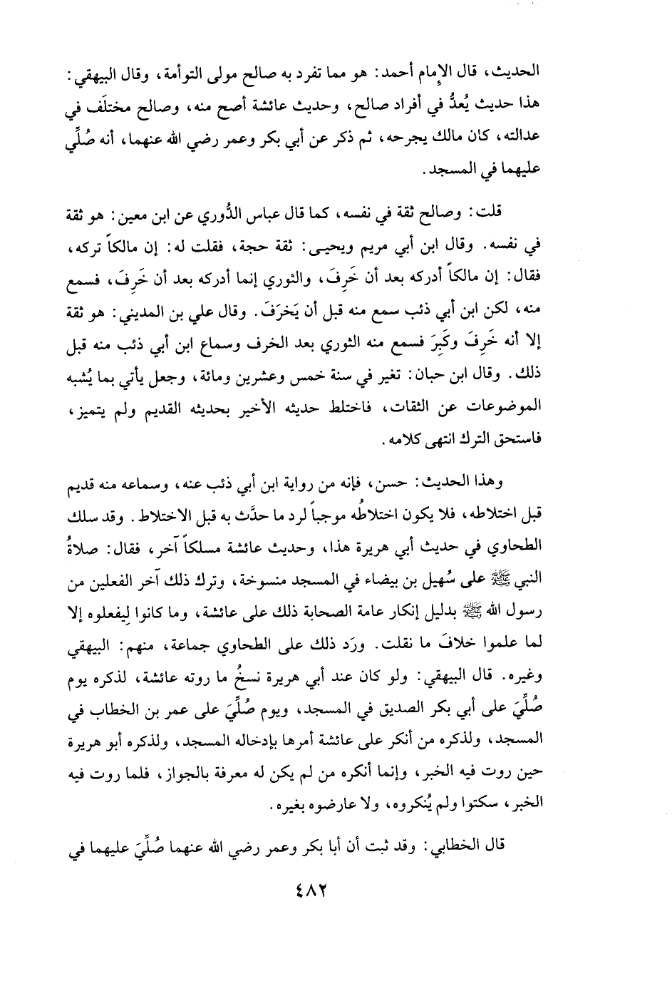 الْحَدِيثَ، قَالَ الْإِمَامُ أَحْمَدُ: هُوَ مِمَّا تَفَرَّدَ بِهِ صالح مولى التوأمة، وَقَالَ البيهقي: هَذَا حَدِيثٌ يُعَدُّ فِي أَفْرَادِ صالح، وَحَدِيثُ عائشة أَصَحُّ مِنْهُ، وصالح مُخْتَلَفٌ فِي عَدَالَتِهِ، كَانَ مالك يُجَرِّحُهُ، ثُمَّ ذَكَرَ عَنْ أبي بكر وعمر - رَضِيَ اللَّهُ عَنْهُمَا - أَنَّهُ صُلِّيَ عَلَيْهِمَا فِي الْمَسْجِدِ.