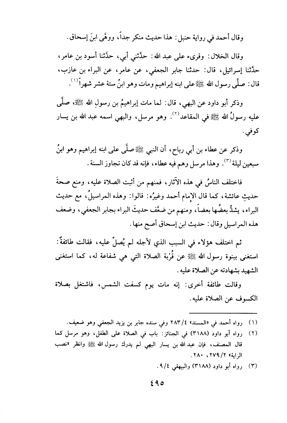 فَاخْتَلَفَ النَّاسُ فِي هَذِهِ الْآثَارِ، فَمِنْهُمْ مَنْ أَثْبَتَ الصَّلَاةَ عَلَيْهِ وَمَنَعَ صِحَّةَ حَدِيثِ عائشة، كَمَا قَالَ الْإِمَامُ أَحْمَدُ وَغَيْرُهُ: قَالُوا: وَهَذِهِ الْمَرَاسِيلُ، مَعَ حَدِيثِ البراء، يَشُدُّ بَعْضُهَا بَعْضًا، وَمِنْهُمْ مَنْ ضَعَّفَ حَدِيثَ البراء بجابر الجعفي، وَضَعَّفَ هَذِهِ الْمَرَاسِيلَ، وَقَالَ: حَدِيثُ ابْنِ إِسْحَاقَ أَصَحُّ مِنْهَا.
