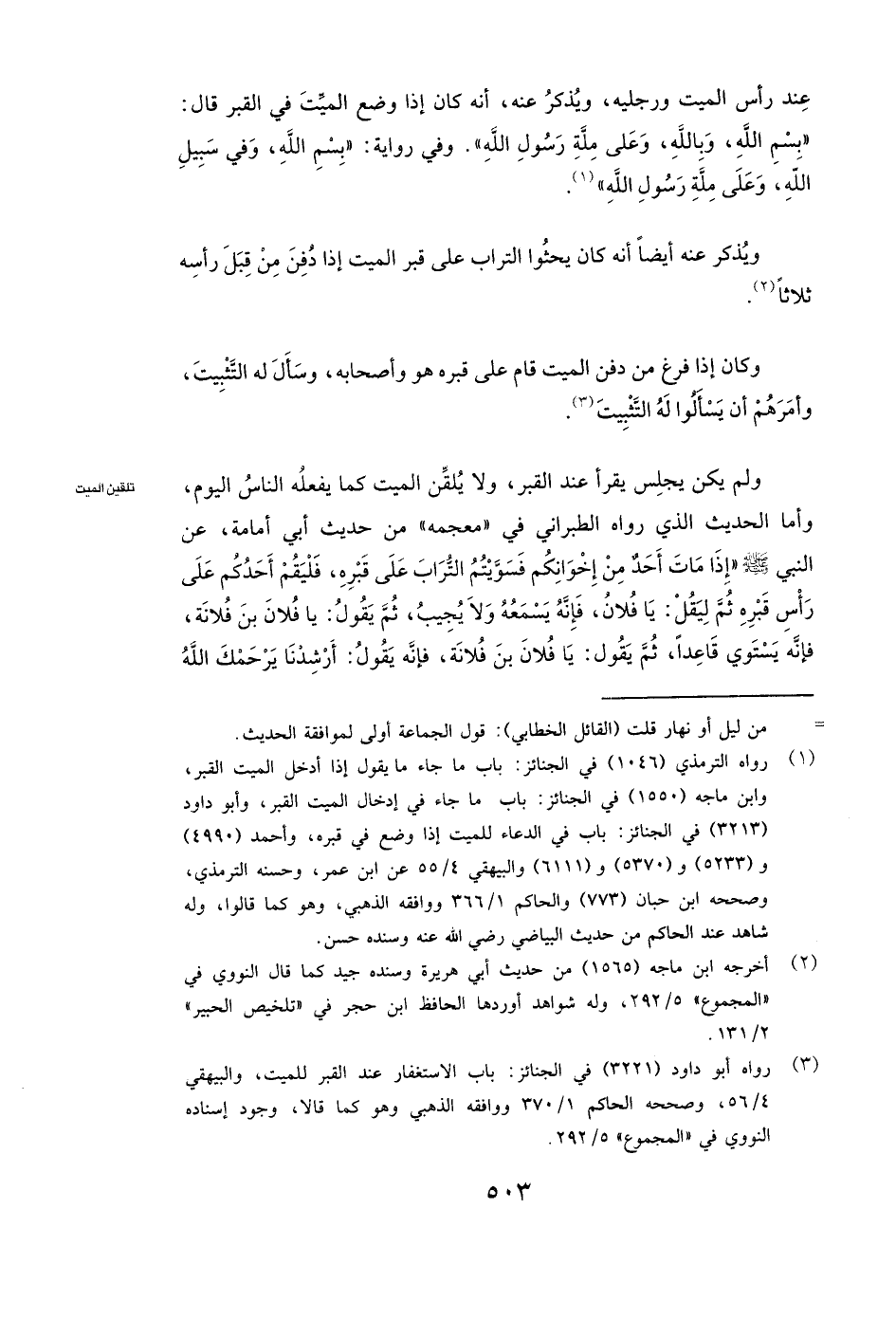 وَكَانَ إِذَا فَرَغَ مِنْ دَفْنِ الْمَيِّتِ قَامَ عَلَى قَبْرِهِ هُوَ وَأَصْحَابُهُ، وَسَأَلَ لَهُ التَّثْبِيتَ، وَأَمَرَهُمْ أَنْ يَسْأَلُوا لَهُ التَّثْبِيتَ.