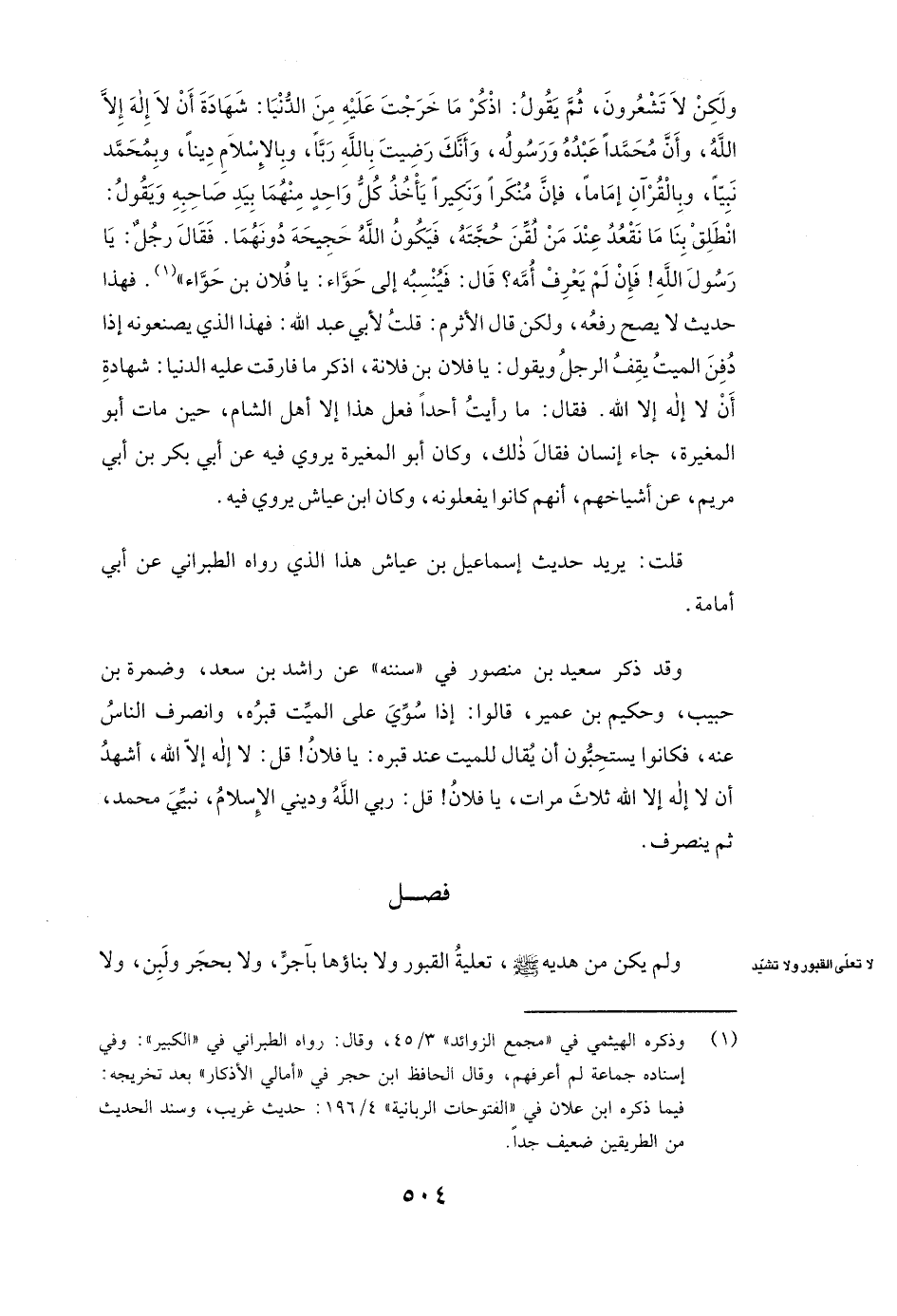 وَلَكِنْ لَا تَشْعُرُونَ، ثُمَّ يَقُولُ: اذْكُرْ مَا خَرَجْتَ عَلَيْهِ مِنَ الدُّنْيَا: شَهَادَةُ أَنْ لَا إِلَهَ إِلَّا اللَّهُ وَأَنَّ مُحَمَّدًا عَبْدُهُ وَرَسُولُهُ، وَأَنَّكَ رَضِيتَ بِاللَّهِ رَبًّا، وَبِالْإِسْلَامِ دِينًا، وَبِمُحَمَّدٍ نَبِيًّا، وَبِالْقُرْآنِ إِمَامًا، فَإِنَّ مُنْكَرًا وَنَكِيرًا يَأْخُذُ كُلُّ وَاحِدٍ مِنْهُمَا بِيَدِ صَاحِبِهِ وَيَقُولُ: انْطَلِقْ بِنَا مَا نَقْعُدُ عِنْدَ مَنْ لُقِّنَ حُجَّتَهُ، فَيَكُونُ اللَّهُ حَجِيجَهُ دُونَهُمَا. فَقَالَ رَجُلٌ: يَا رَسُولَ اللَّهِ! فَإِنْ لَمْ يَعْرِفْ أُمَّهُ؟ قَالَ: فَيَنْسِبُهُ إِلَى حواء: يَا فُلَانُ بْنُ حواء» ) . فَهَذَا حَدِيثٌ لَا يَصِحُّ رَفْعُهُ، وَلَكِنْ قَالَ الأثرم: قُلْتُ لأبي عبد الله: فَهَذَا الَّذِي يَصْنَعُونَهُ إِذَا دُفِنَ الْمَيِّتُ يَقِفُ الرَّجُلُ، وَيَقُولُ: يَا فُلَانُ بْنُ فُلَانَةَ، اذْكُرْ مَا فَارَقْتَ عَلَيْهِ الدُّنْيَا: شَهَادَةُ أَنْ لَا إِلَهَ إِلَّا اللَّهُ. فَقَالَ مَا رَأَيْتُ أَحَدًا فَعَلَ هَذَا إِلَّا أَهْلَ الشَّامِ، حِينَ مَاتَ أبو المغيرة، جَاءَ إِنْسَانٌ فَقَالَ ذَلِكَ، وَكَانَ أبو المغيرة يَرْوِي فِيهِ عَنْ أَبِي بَكْرِ بْنِ أَبِي مَرْيَمَ، عَنْ أَشْيَاخِهِمْ، أَنَّهُمْ كَانُوا يَفْعَلُونَهُ، وَكَانَ ابن عياش يَرْوِي فِيهِ.