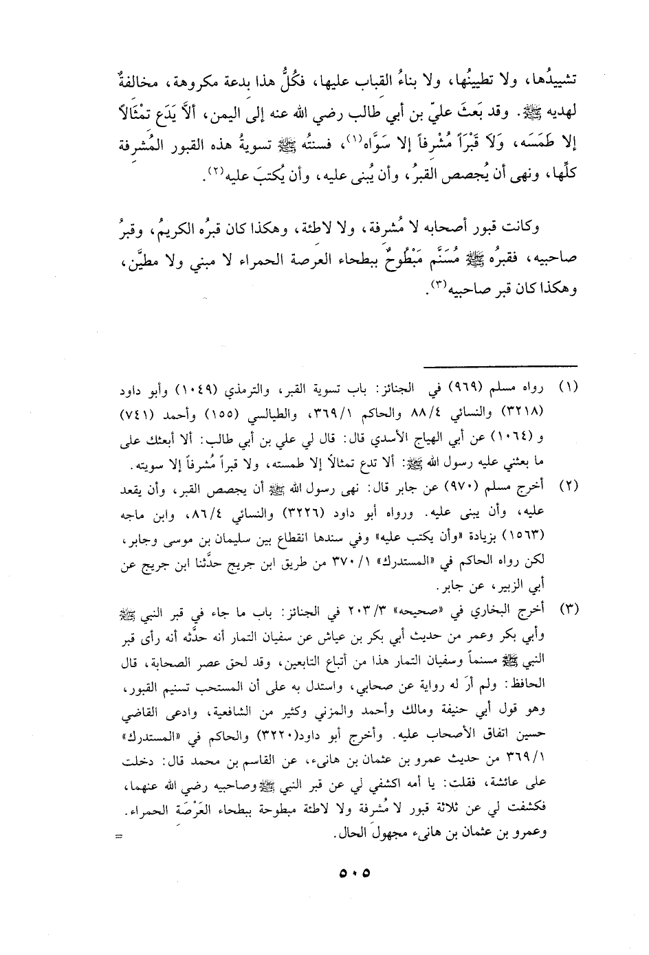 تَشْيِيدُهَا، وَلَا تَطْيِينُهَا، وَلَا بِنَاءُ الْقِبَابِ عَلَيْهَا، فَكُلُّ هَذَا بِدْعَةٌ مَكْرُوهَةٌ، مُخَالِفَةٌ لِهَدْيِهِ صَلَّى اللَّهُ عَلَيْهِ وَسَلَّمَ. وَقَدْ «بَعَثَ عَلِيُّ بْنُ أَبِي طَالِبٍ - رَضِيَ اللَّهُ عَنْهُ - إِلَى الْيَمَنِ، أَلَّا يَدَعَ تِمْثَالًا إِلَّا طَمَسَهُ، وَلَا قَبْرًا مُشْرِفًا إِلَّا سَوَّاهُ» ، فَسُنَّتُهُ - صَلَّى اللَّهُ عَلَيْهِ وَسَلَّمَ - تَسْوِيَةُ هَذِهِ الْقُبُورِ الْمُشْرِفَةِ كُلِّهَا، ( «وَنَهَى أَنْ يُجَصَّصَ الْقَبْرُ وَأَنْ يُبْنَى عَلَيْهِ وَأَنْ يُكْتَبَ عَلَيْهِ» ) .