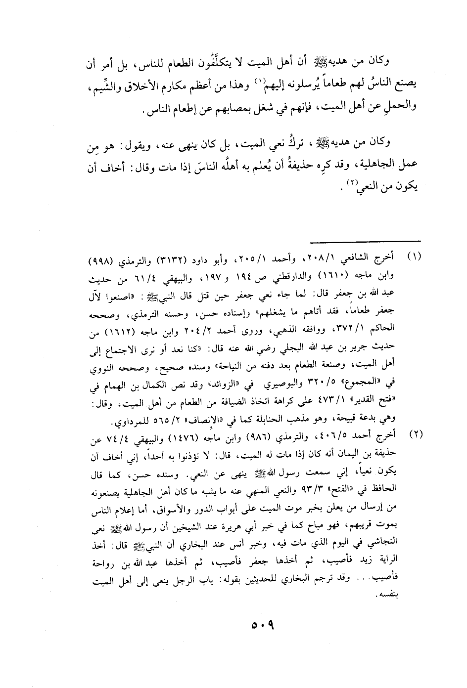 وَكَانَ مِنْ هَدْيِهِ - صَلَّى اللَّهُ عَلَيْهِ وَسَلَّمَ - أَنَّ أَهْلَ الْمَيِّتِ لَا يَتَكَلَّفُونَ الطَّعَامَ لِلنَّاسِ، بَلْ أَمَرَ أَنْ يَصْنَعَ النَّاسُ لَهُمْ طَعَامًا يُرْسِلُونَهُ إِلَيْهِمْ، وَهَذَا مِنْ أَعْظَمِ مَكَارِمِ الْأَخْلَاقِ وَالشِّيَمِ، وَالْحَمْلِ عَنْ أَهْلِ الْمَيِّتِ، فَإِنَّهُمْ فِي شُغْلٍ بِمُصَابِهِمْ عَنْ إِطْعَامِ النَّاسِ.