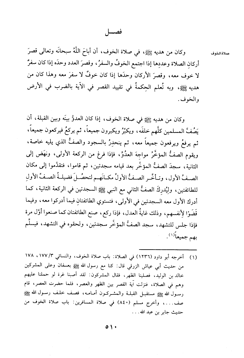 وَكَانَ مِنْ هَدْيِهِ - صَلَّى اللَّهُ عَلَيْهِ وَسَلَّمَ - فِي صَلَاةِ الْخَوْفِ أَنْ أَبَاحَ اللَّهُ سُبْحَانَهُ وَتَعَالَى قَصْرَ أَرْكَانِ الصَّلَاةِ وَعَدَدِهَا إِذَا اجْتَمَعَ الْخَوْفُ وَالسَّفَرُ، وَقَصْرُ الْعَدَدِ وَحْدَهُ إِذَا كَانَ سَفَرٌ لَا خَوْفَ مَعَهُ، وَقَصْرُ الْأَرْكَانِ وَحْدَهَا إِذَا كَانَ خَوْفٌ لَا سَفَرَ مَعَهُ، وَهَذَا كَانَ مِنْ هَدْيِهِ صَلَّى اللَّهُ عَلَيْهِ وَسَلَّمَ، وَبِهِ تُعْلَمُ الْحِكْمَةُ فِي تَقْيِيدِ الْقَصْرِ فِي الْآيَةِ بِالضَّرْبِ فِي الْأَرْضِ وَالْخَوْفِ.