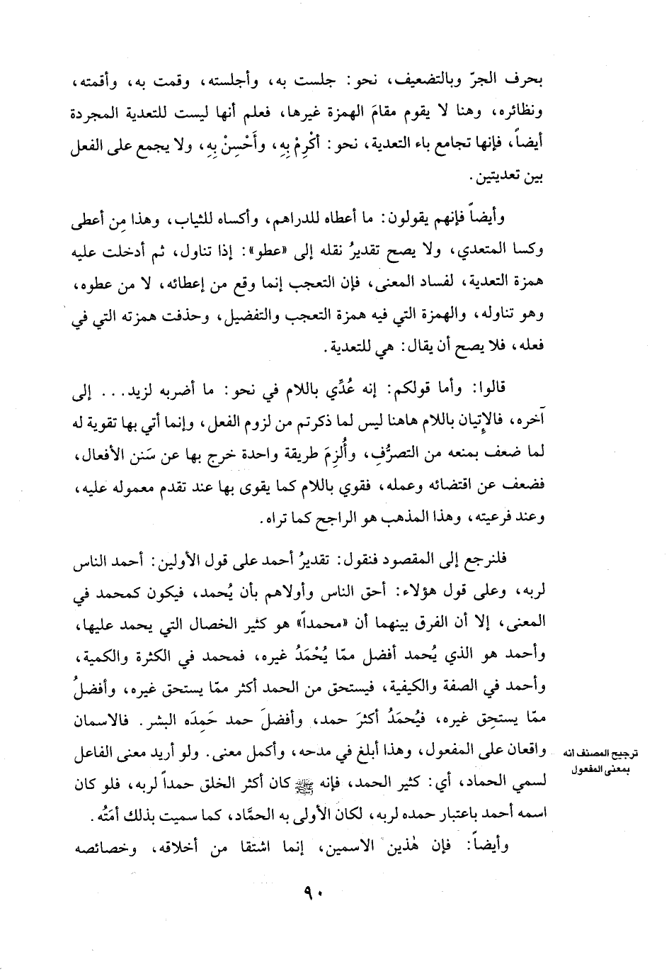 فَلْنَرْجِعْ إِلَى الْمَقْصُودِ فَنَقُولُ: تَقْدِيرُ أَحْمَدَ عَلَى قَوْلِ الْأَوَّلِينَ: أَحْمَدُ النَّاسِ لِرَبِّهِ، وَعَلَى قَوْلِ هَؤُلَاءِ: أَحَقُّ النَّاسِ وَأَوْلَاهُمْ بِأَنْ يُحْمَدَ، فَيَكُونُ كَمُحَمَّدٍ فِي الْمَعْنَى، إِلَّا أَنَّ الْفَرْقَ بَيْنَهُمَا أَنَّ " مُحَمَّدًا " هُوَ كَثِيرُ الْخِصَالِ الَّتِي يُحْمَدُ عَلَيْهَا، وَ" أَحْمَدُ " هُوَ الَّذِي يُحْمَدُ أَفْضَلَ مِمَّا يُحْمَدُ غَيْرُهُ، فَمُحَمَّدٌ فِي الْكَثْرَةِ وَالْكَمِّيَّةِ، وَأَحْمَدُ فِي الصِّفَةِ وَالْكَيْفِيَّةِ، فَيَسْتَحِقُّ مِنَ الْحَمْدِ أَكْثَرَ مِمَّا يَسْتَحِقُّ غَيْرُهُ، وَأَفْضَلَ مِمَّا يَسْتَحِقُّ غَيْرُهُ، فَيُحْمَدُ أَكْثَرَ حَمْدٍ وَأَفْضَلَ حَمْدٍ حَمِدَهُ الْبَشَرُ. فَالِاسْمَانِ وَاقِعَانِ عَلَى الْمَفْعُولِ وَهَذَا أَبْلَغُ فِي مَدْحِهِ وَأَكْمَلُ مَعْنًى. وَلَوْ أُرِيدَ مَعْنَى الْفَاعِلِ لَسُمِّيَ الْحَمَّادَ، أَيْ كَثِيرَ الْحَمْدِ، فَإِنَّهُ صَلَّى اللَّهُ عَلَيْهِ وَسَلَّمَ كَانَ أَكْثَرَ الْخَلْقِ حَمْدًا لِرَبِّهِ، فَلَوْ كَانَ اسْمُهُ أَحْمَدَ بِاعْتِبَارِ حَمْدِهِ لِرَبِّهِ لَكَانَ الْأَوْلَى بِهِ الْحَمَّادَ كَمَا سُمِّيَتْ بِذَلِكَ أُمَّتُهُ.