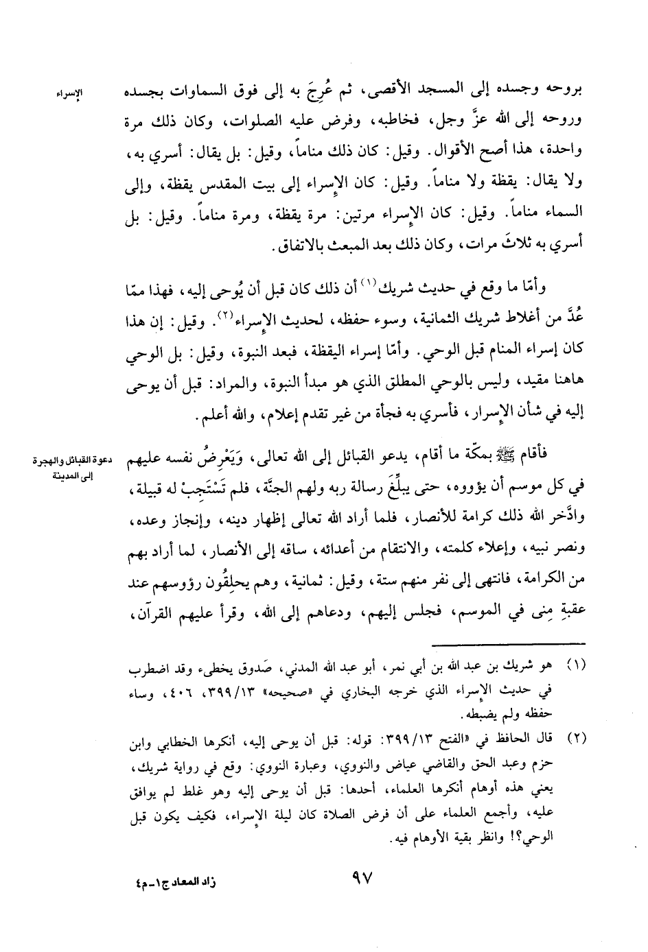 بِرُوحِهِ وَجَسَدِهِ إِلَى الْمَسْجِدِ الْأَقْصَى، ثُمَّ عُرِجَ بِهِ إِلَى فَوْقِ السَّمَاوَاتِ بِجَسَدِهِ وَرُوحِهِ إِلَى اللَّهِ عَزَّ وَجَلَّ، فَخَاطَبَهُ وَفَرَضَ عَلَيْهِ الصَّلَوَاتِ، وَكَانَ ذَلِكَ مَرَّةً وَاحِدَةً، هَذَا أَصَحُّ الْأَقْوَالِ.