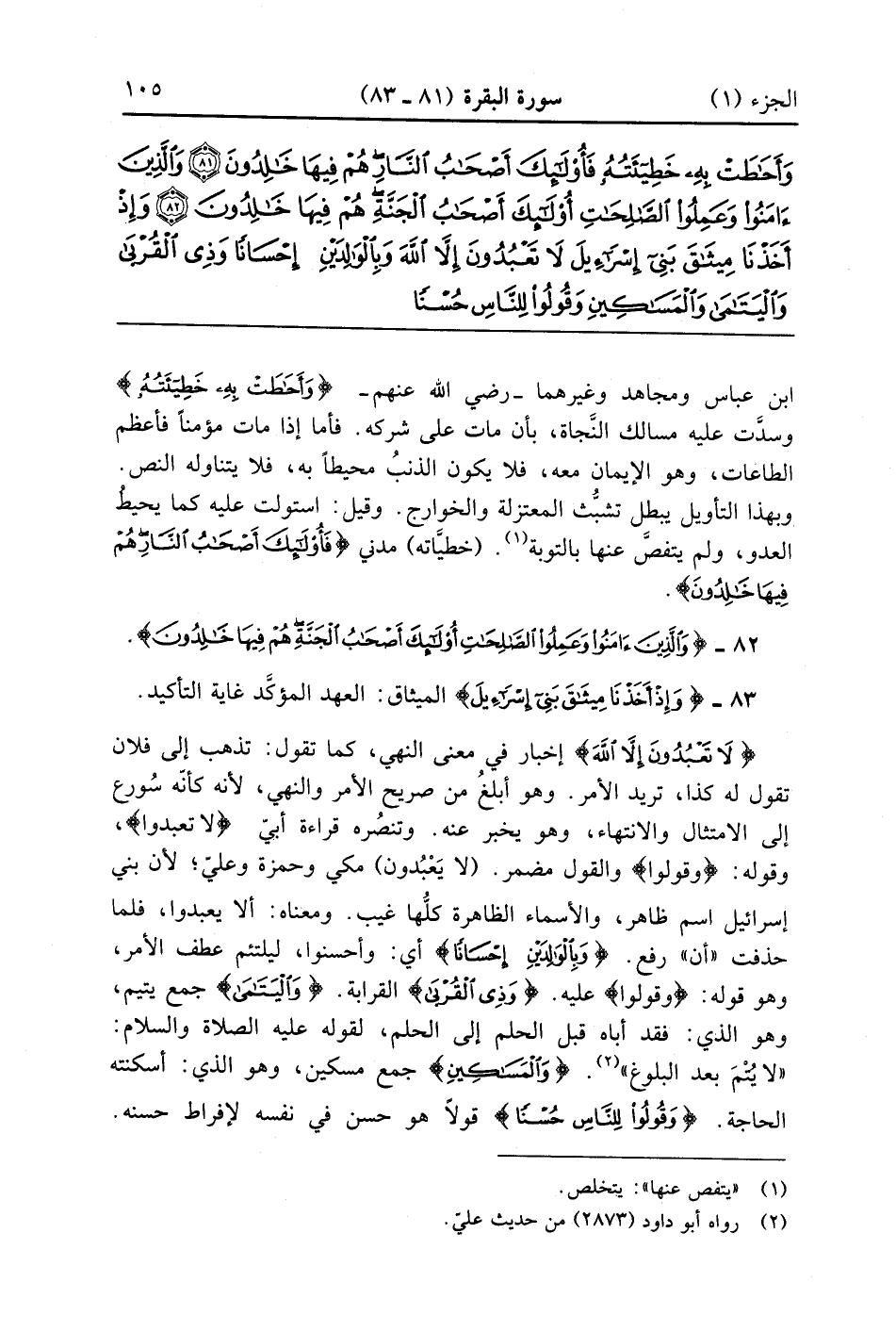 وَإِذْ أَخَذْنَا مِيثَاقَ بَنِي إِسْرَائِيلَ لَا تَعْبُدُونَ إِلَّا اللَّهَ وَبِالْوَالِدَيْنِ إِحْسَانًا وَذِي الْقُرْبَى وَالْيَتَامَى وَالْمَسَاكِينِ وَقُولُوا لِلنَّاسِ حُسْنًا وَأَقِيمُوا الصَّلَاةَ وَآتُوا الزَّكَاةَ ثُمَّ تَوَلَّيْتُمْ إِلَّا قَلِيلًا مِنْكُمْ وَأَنْتُمْ مُعْرِضُونَ (83)