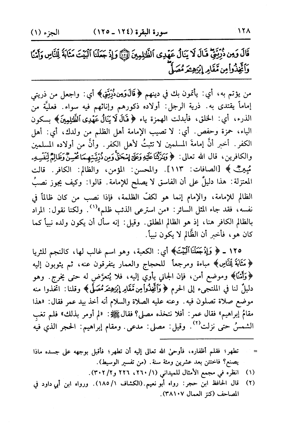 وَإِذْ جَعَلْنَا الْبَيْتَ مَثَابَةً لِلنَّاسِ وَأَمْنًا وَاتَّخِذُوا مِنْ مَقَامِ إِبْرَاهِيمَ مُصَلًّى وَعَهِدْنَا إِلَى إِبْرَاهِيمَ وَإِسْمَاعِيلَ أَنْ طَهِّرَا بَيْتِيَ لِلطَّائِفِينَ وَالْعَاكِفِينَ وَالرُّكَّعِ السُّجُودِ (125)