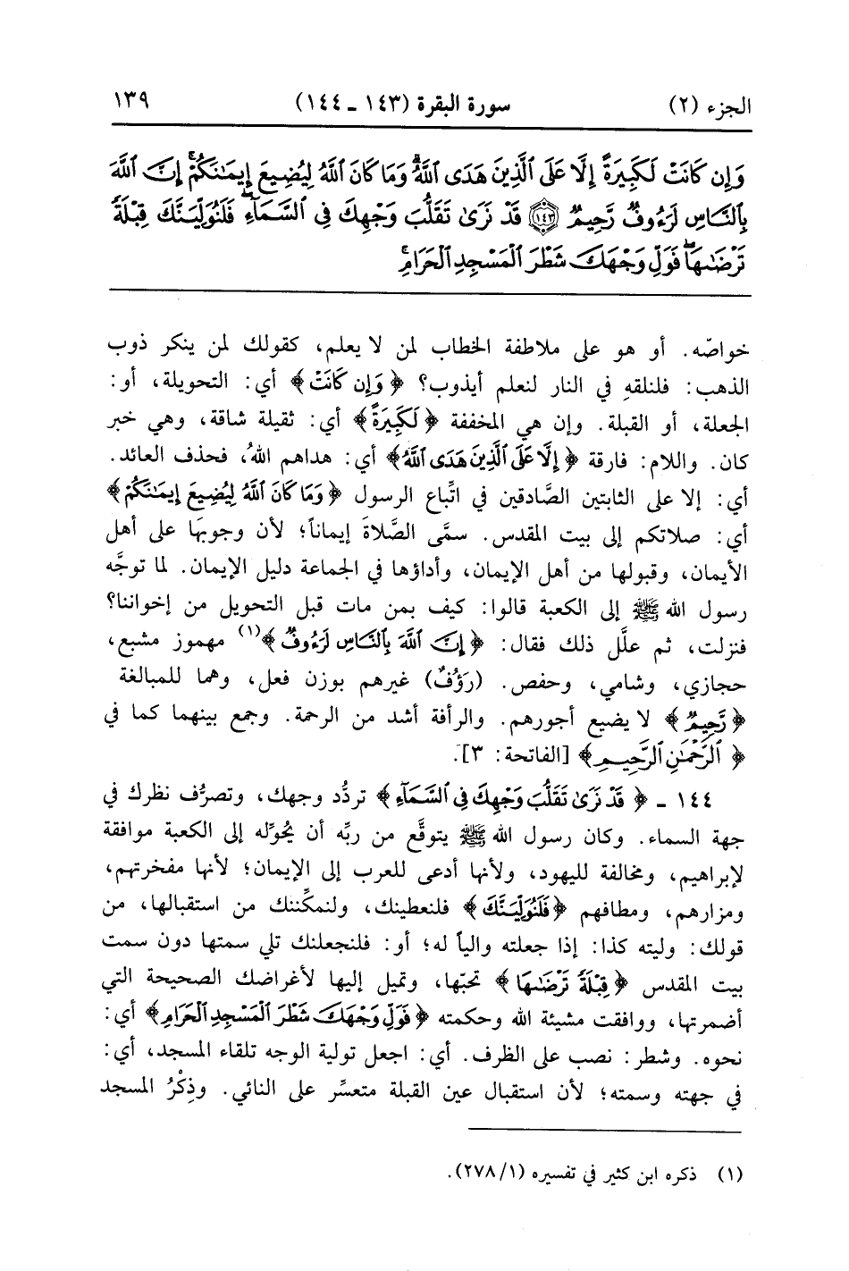 قَدْ نَرَى تَقَلُّبَ وَجْهِكَ فِي السَّمَاءِ فَلَنُوَلِّيَنَّكَ قِبْلَةً تَرْضَاهَا فَوَلِّ وَجْهَكَ شَطْرَ الْمَسْجِدِ الْحَرَامِ وَحَيْثُ مَا كُنْتُمْ فَوَلُّوا وُجُوهَكُمْ شَطْرَهُ وَإِنَّ الَّذِينَ أُوتُوا الْكِتَابَ لَيَعْلَمُونَ أَنَّهُ الْحَقُّ مِنْ رَبِّهِمْ وَمَا اللَّهُ بِغَافِلٍ عَمَّا يَعْمَلُونَ (144)