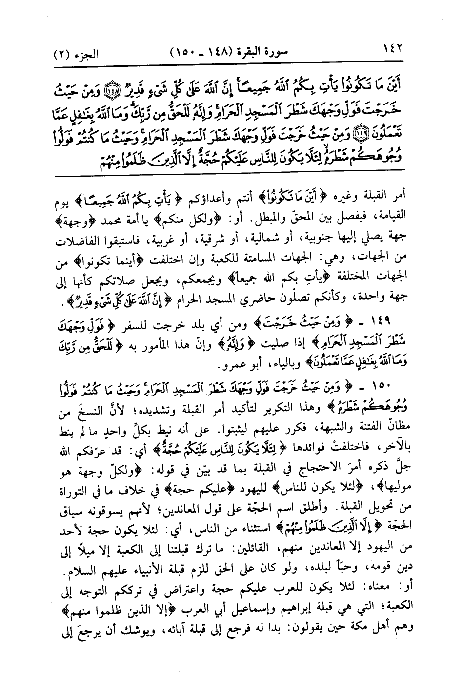 وَمِنْ حَيْثُ خَرَجْتَ فَوَلِّ وَجْهَكَ شَطْرَ الْمَسْجِدِ الْحَرَامِ وَحَيْثُ مَا كُنْتُمْ فَوَلُّوا وُجُوهَكُمْ شَطْرَهُ لِئَلَّا يَكُونَ لِلنَّاسِ عَلَيْكُمْ حُجَّةٌ إِلَّا الَّذِينَ ظَلَمُوا مِنْهُمْ فَلَا تَخْشَوْهُمْ وَاخْشَوْنِي وَلِأُتِمَّ نِعْمَتِي عَلَيْكُمْ وَلَعَلَّكُمْ تَهْتَدُونَ (150)
