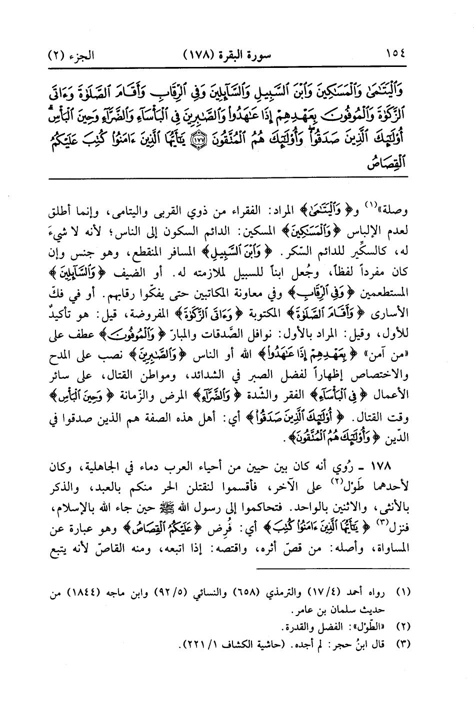 يَا أَيُّهَا الَّذِينَ آمَنُوا كُتِبَ عَلَيْكُمُ الْقِصَاصُ فِي الْقَتْلَى الْحُرُّ بِالْحُرِّ وَالْعَبْدُ بِالْعَبْدِ وَالْأُنْثَى بِالْأُنْثَى فَمَنْ عُفِيَ لَهُ مِنْ أَخِيهِ شَيْءٌ فَاتِّبَاعٌ بِالْمَعْرُوفِ وَأَدَاءٌ إِلَيْهِ بِإِحْسَانٍ ذَلِكَ تَخْفِيفٌ مِنْ رَبِّكُمْ وَرَحْمَةٌ فَمَنِ اعْتَدَى بَعْدَ ذَلِكَ فَلَهُ عَذَابٌ أَلِيمٌ (178)