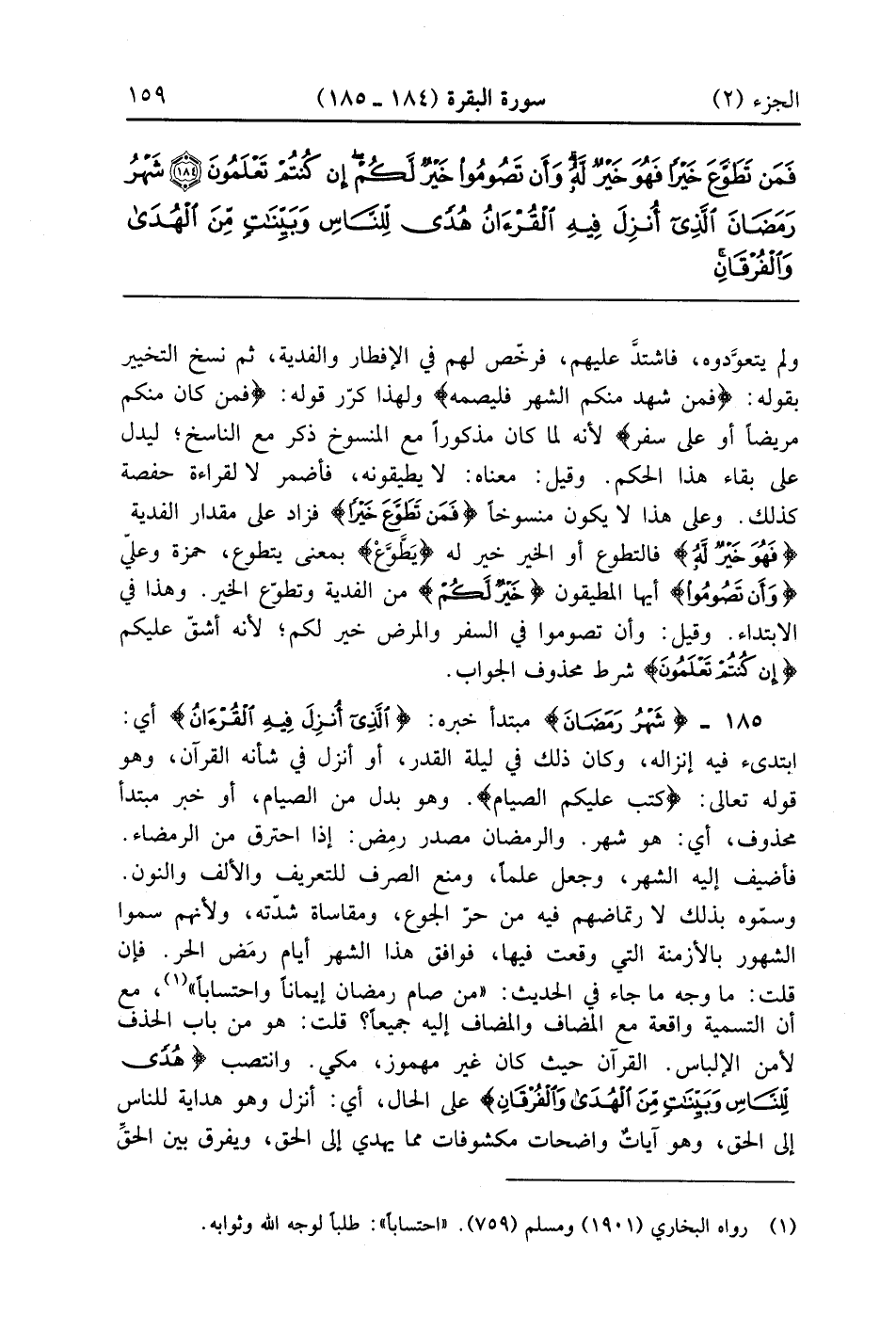 شَهْرُ رَمَضَانَ الَّذِي أُنْزِلَ فِيهِ الْقُرْآنُ هُدًى لِلنَّاسِ وَبَيِّنَاتٍ مِنَ الْهُدَى وَالْفُرْقَانِ فَمَنْ شَهِدَ مِنْكُمُ الشَّهْرَ فَلْيَصُمْهُ وَمَنْ كَانَ مَرِيضًا أَوْ عَلَى سَفَرٍ فَعِدَّةٌ مِنْ أَيَّامٍ أُخَرَ يُرِيدُ اللَّهُ بِكُمُ الْيُسْرَ وَلَا يُرِيدُ بِكُمُ الْعُسْرَ وَلِتُكْمِلُوا الْعِدَّةَ وَلِتُكَبِّرُوا اللَّهَ عَلَى مَا هَدَاكُمْ وَلَعَلَّكُمْ تَشْكُرُونَ (185)