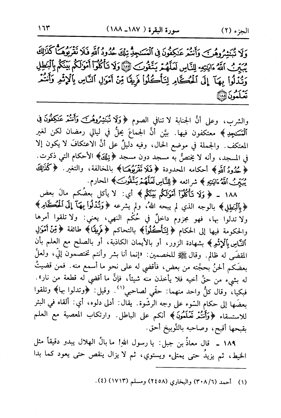 وَلَا تَأْكُلُوا أَمْوَالَكُمْ بَيْنَكُمْ بِالْبَاطِلِ وَتُدْلُوا بِهَا إِلَى الْحُكَّامِ لِتَأْكُلُوا فَرِيقًا مِنْ أَمْوَالِ النَّاسِ بِالْإِثْمِ وَأَنْتُمْ تَعْلَمُونَ (188)