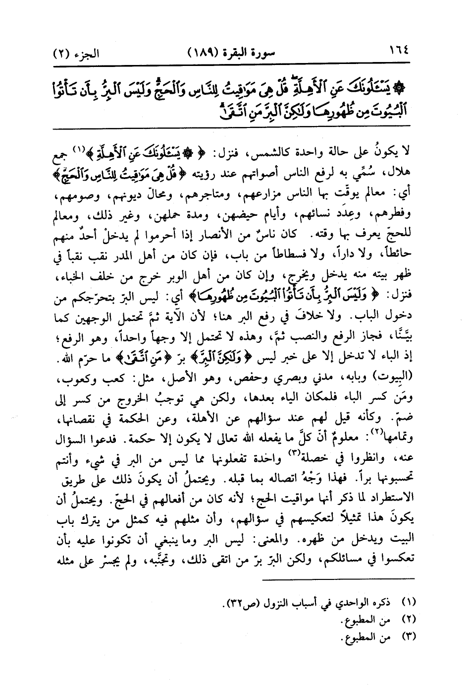 لا يكون على حالة واحدة كالشمس فنزل {يسألونك عَنِ الأهلة} جمع هلال سمي به لرفع الناس أصواتهم عند رؤيته {قُلْ هِىَ مَوَاقِيتُ لِلنَّاسِ والحج} أي معالم يوقت بها الناس مزارعهم ومتاجرهم ومحال ديونهم وصومهم وفطرهم وعدة نسائهم وأيام حيضهن ومدة حملهن وغير ذلك ومعالم للحج يعرف بها وقته كان ناس من الأنصار إذا أحرموا لم يدخل أحد منهم حائطا ولا دار ولا فسطاطاً من باب فإن كان من أهل الدر نقب نقباً في ظهر بيته منه يدخل ويخرج وإن كان من أهل الوبر خرج من خلف الخباء فنزل {وَلَيْسَ البر بِأَن تَأْتُواْ البيوت مِن ظُهُورِهَا} أي ليس البر بتحرجكم من دخول الباب ولا خلاف في رفع البر هنا لأن الآية ثمة تحتمل الوجهين كما بينا فجاز الرفع والنصب ثمة وهذه لا تحتمل إلا وجهاً واحداً وهو الرفع إذ الباء لا تدخل إلا على خبر ليس {ولكن البر} بر {مَنِ اتقى} ما حرم الله البيوت وبابه مدني وبصري وحفص وهو الأصل مثل كعب وكعوب ومن كسر الباء فلمكان الياء بعدها ولكن هي توجب الخروج من كسر إلى ضم وكأنه قيل لهم عند سؤالهم عن الأهلة وعن الحكمة في نقصانها وتمامها معلوم أن كل ما يفعله الله تعالى لا يكون إلا حكمة فدعوا السؤال عنه وانظروا في خصلة واحدة تفعلونها مما ليس من البر في شيء وأنتم تحسبونها براً فهذا وجه اتصاله بما قبله ويحتمل أن يكون ذلك على طريق الاستطراد لما ذكر أنها مواقيت الحج لأنه كان من أفعالهم في الحج ويحتمل أن يكون هذا تمثيلاً لتعكيسهم في سؤالهم وإن مثلهم فيه كمثل من يترك باب البيت ويدخل من ظهره والمعنى ليس البر وما ينبغي أن تكونوا عليه بأن تعكسوا في مسائلكم ولكن البر بر من اتقى ذلك وتجنبه ولم يجسر على مثله