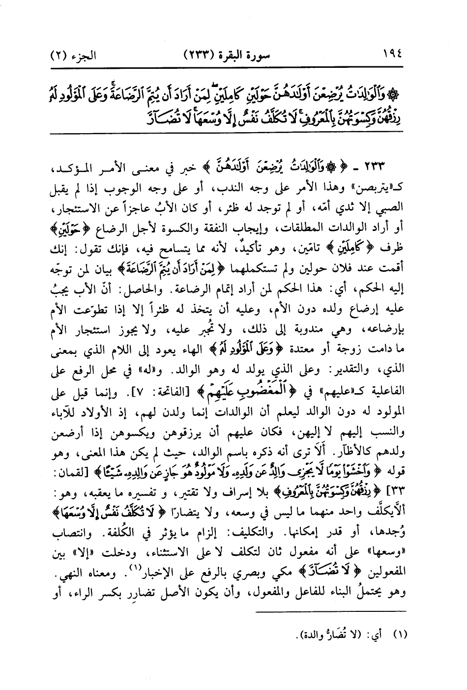 وَالْوَالِدَاتُ يُرْضِعْنَ أَوْلَادَهُنَّ حَوْلَيْنِ كَامِلَيْنِ لِمَنْ أَرَادَ أَنْ يُتِمَّ الرَّضَاعَةَ وَعَلَى الْمَوْلُودِ لَهُ رِزْقُهُنَّ وَكِسْوَتُهُنَّ بِالْمَعْرُوفِ لَا تُكَلَّفُ نَفْسٌ إِلَّا وُسْعَهَا لَا تُضَارَّ وَالِدَةٌ بِوَلَدِهَا وَلَا مَوْلُودٌ لَهُ بِوَلَدِهِ وَعَلَى الْوَارِثِ مِثْلُ ذَلِكَ فَإِنْ أَرَادَا فِصَالًا عَنْ تَرَاضٍ مِنْهُمَا وَتَشَاوُرٍ فَلَا جُنَاحَ عَلَيْهِمَا وَإِنْ أَرَدْتُمْ أَنْ تَسْتَرْضِعُوا أَوْلَادَكُمْ فَلَا جُنَاحَ عَلَيْكُمْ إِذَا سَلَّمْتُمْ مَا آتَيْتُمْ بِالْمَعْرُوفِ وَاتَّقُوا اللَّهَ وَاعْلَمُوا أَنَّ اللَّهَ بِمَا تَعْمَلُونَ بَصِيرٌ (233)
